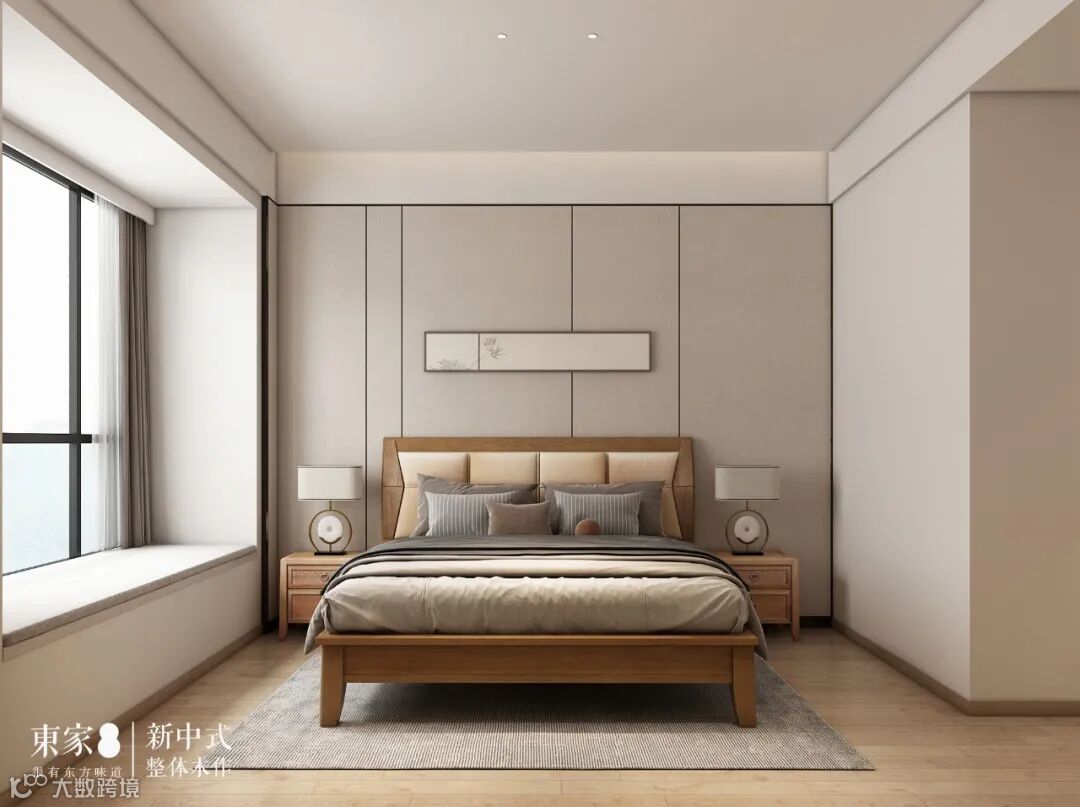 主卧采用米灰色墙布、装饰画为主要设计元素,设计师注重每一个细节,呈现出主人“去留无意,望天上云卷云舒”淡泊心境。