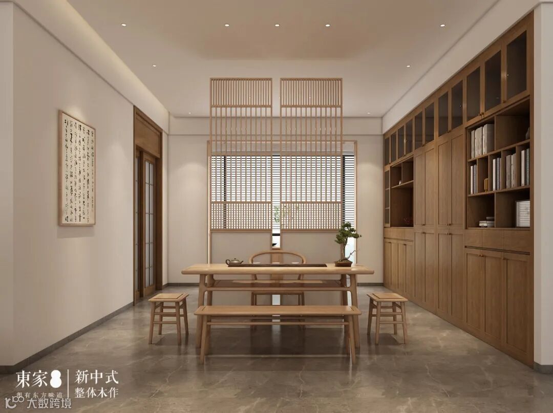 茶室与餐厅沿袭客厅原木与纯白的色调搭配,独具一格的木格栅屏风将茶室与餐厅一隔为二,实现虚和实的结合,使两个空间互相独立又相互连接。