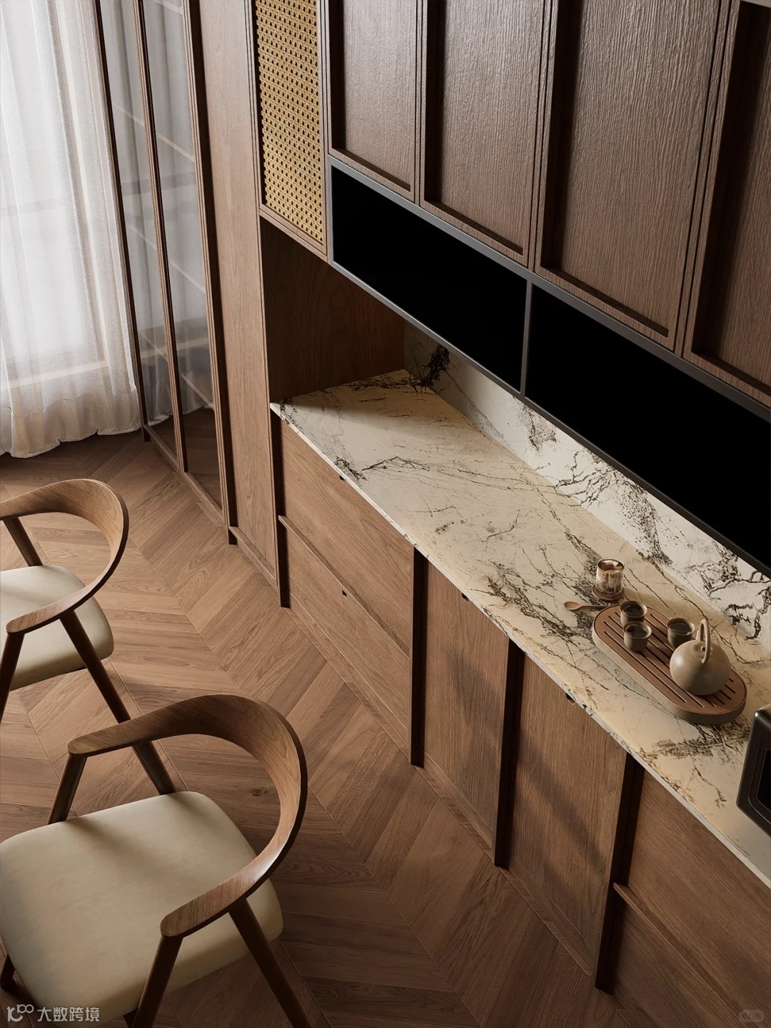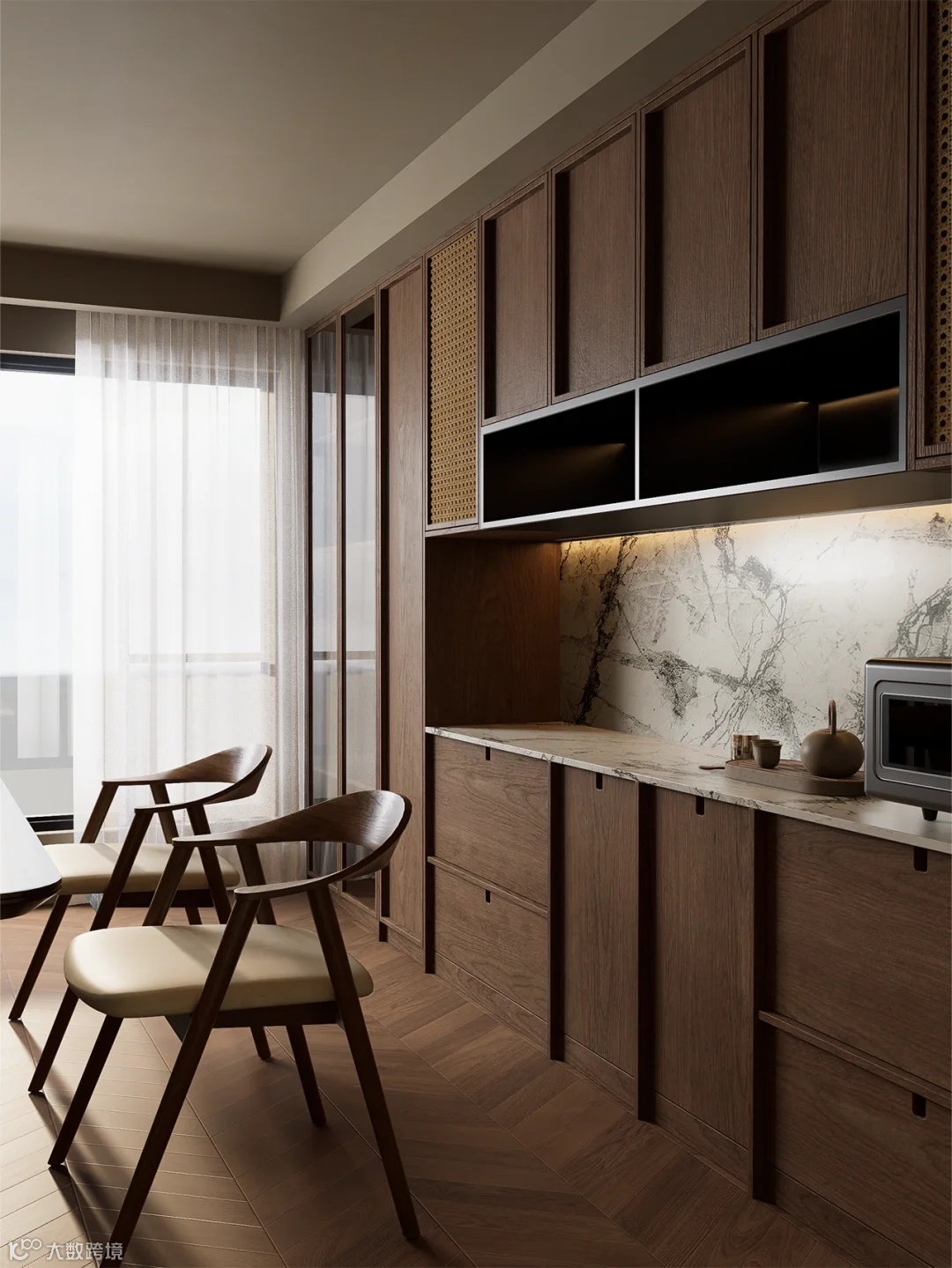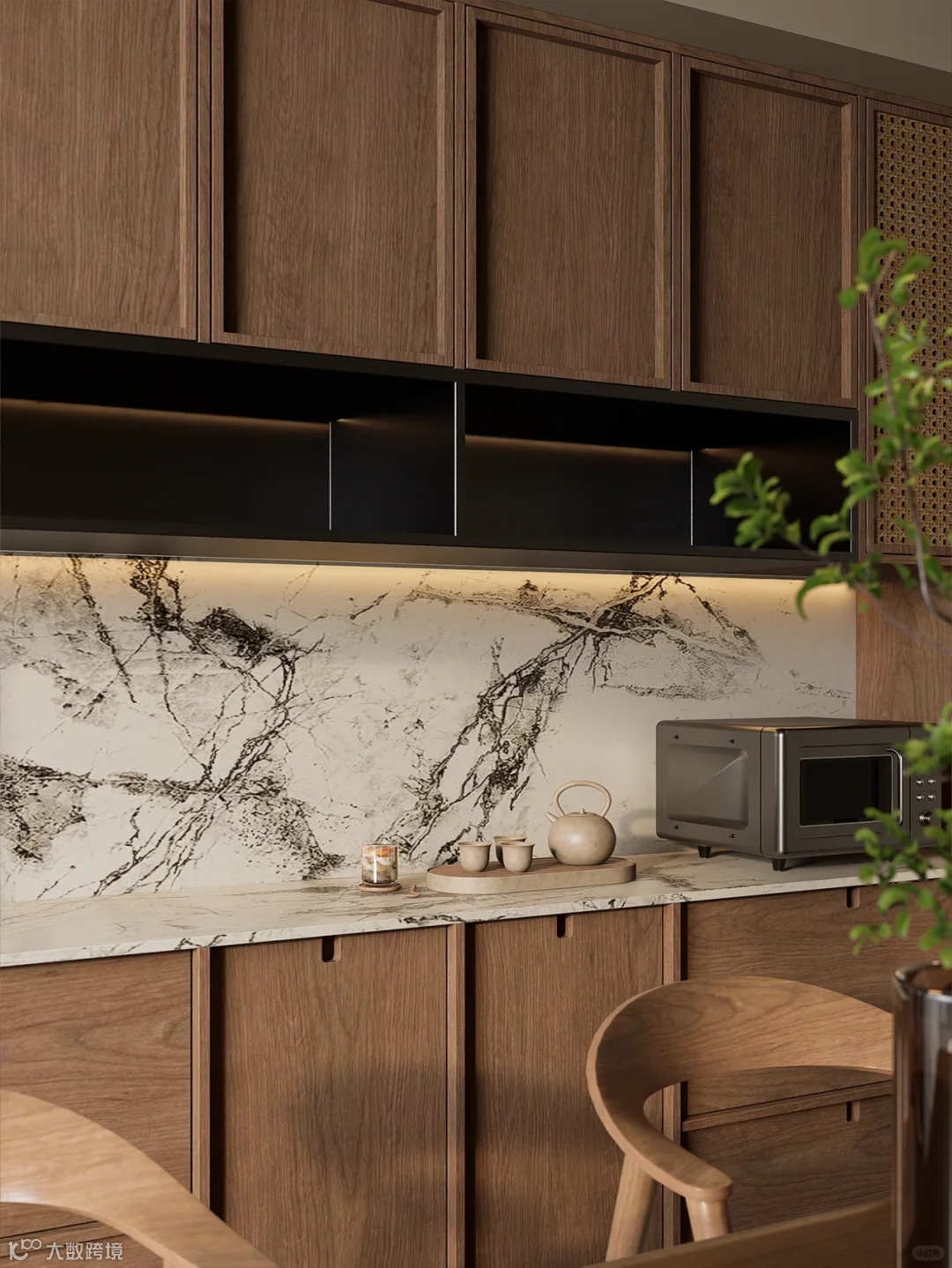 柜体设计独具巧思,开放式置物架可陈列常看的食谱、雅致茶具,随时取用,增添生活仪式感。