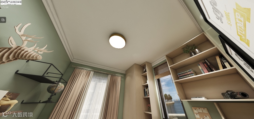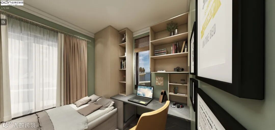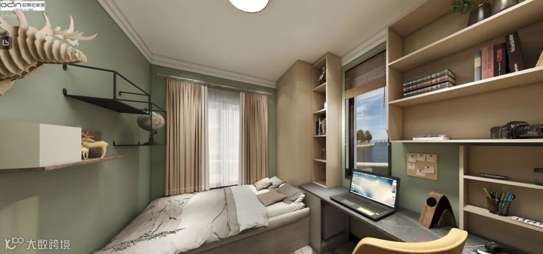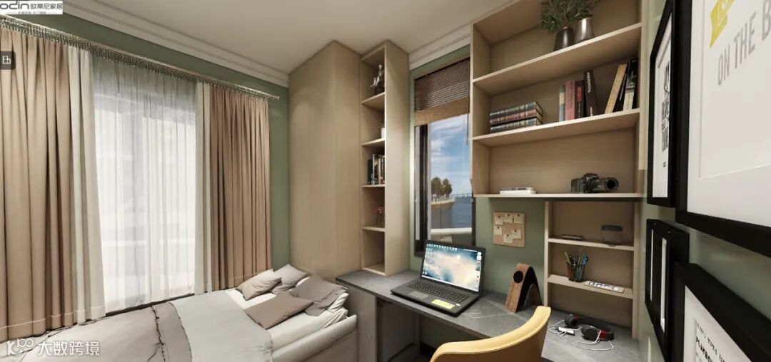 客卧虽然空间不大,但在家具布置和细节搭配上相对于主卧更胜一筹,整体房屋采用的是黄绿的经典自然色系搭配,定制榻榻米和连体写字台点缀更立体的层次感,凸显出自然风情和多元化的魅力。