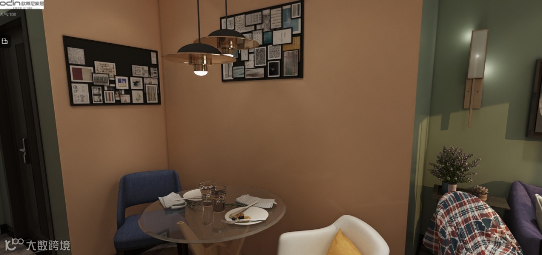 餐厅悬挂两个高低不同的吊灯堪称亮点,不仅让光源聚集在餐桌之上,让住户尽情享用美食,折叠墙最怕视觉聚焦在墙角,关注空间的狭小,为了增强空间整体的立体感,最大化的利用多元化元素对空间进行美化,两个墙面贴着美式图集,给人以温馨的感觉,同时富有鲜明个性。