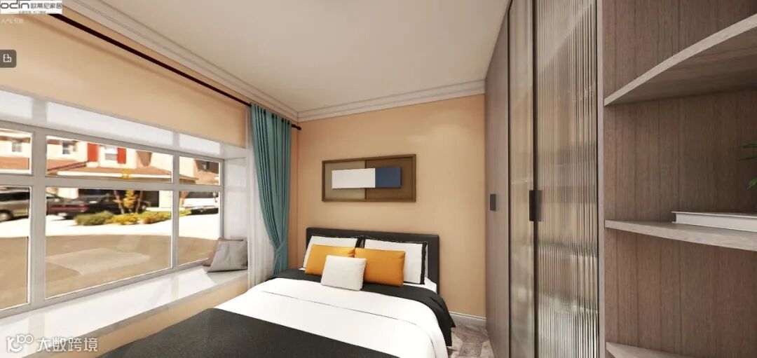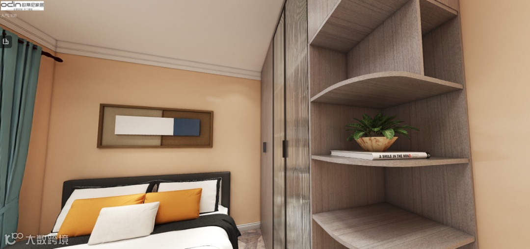 定制衣柜和角柜的结合天马行空,避免了传统衣柜棱角的突兀,又让角柜成为展示柜的主要功能,可摆放各类书籍和手工艺品,让生活充满情调,墙上悬挂的横向画框,没有过于多余的构图,而是简约的画面组成,贴近人文色彩。
