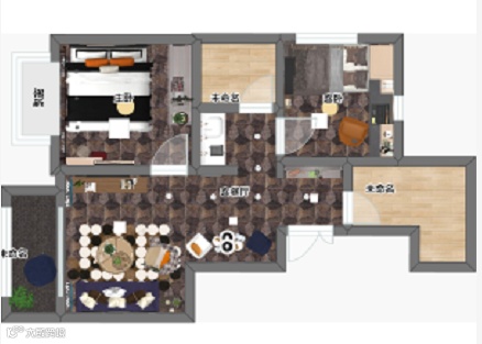 地板采用了欧蒂尼一贯的深棕样式,搭配以浅色和深色的纹理结合,形成错落有致的花纹,大大增加了室内地面的立体感,让人心情愉悦,同时客厅沙发前边的地面铺设的圆形装饰毯,犹如中国围棋的黑白结合,让中西元素形成完美嫁接。