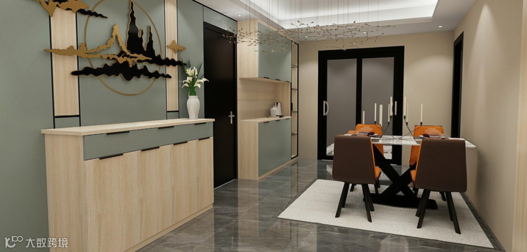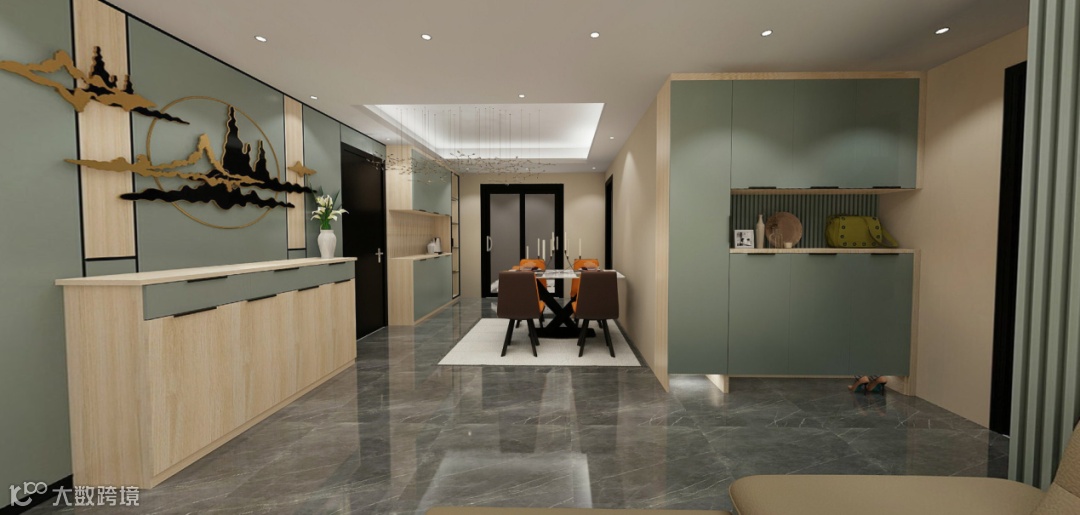 深绿色角柜可摆放各类名酒,旁边的白色储物柜可摆放各类餐厅物品,让空间井然有序。