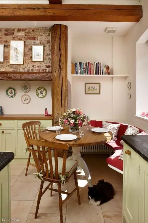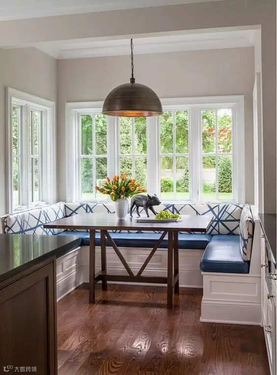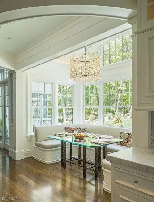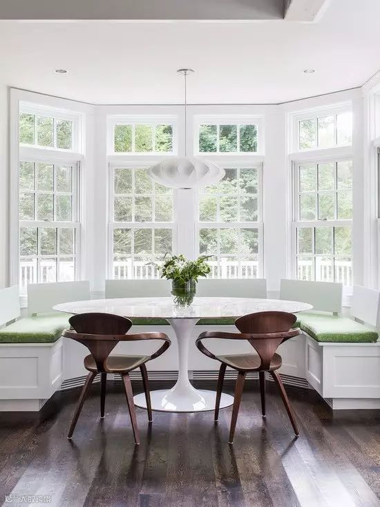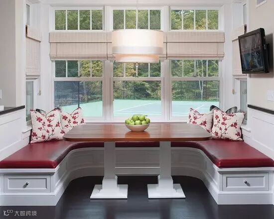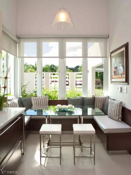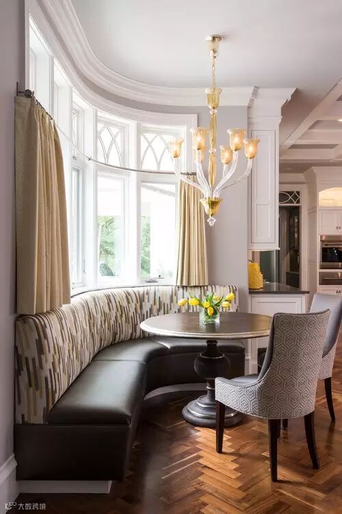 弧形卡座一般会设置在拐角处或者弧形墙的位置,当弧形卡座跟飘窗结合在一起,并设计在开放式厨房的一侧,会让视觉十分宽广,家居空间也被无形放大。