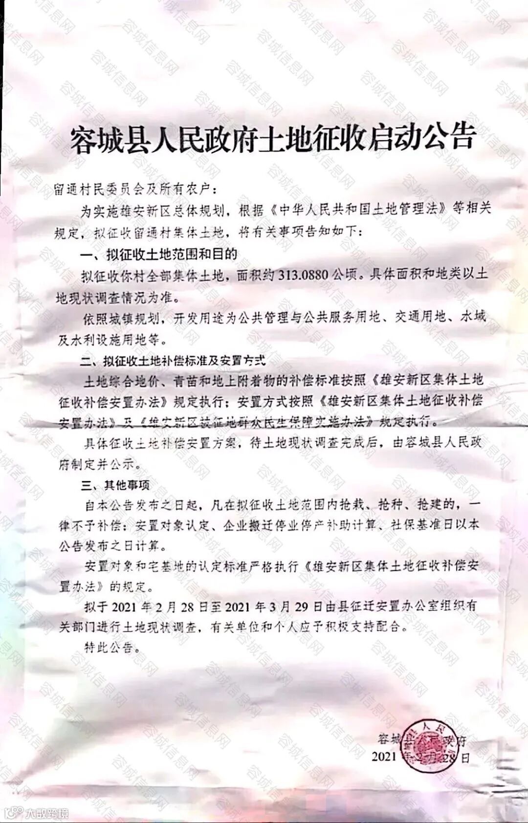 容城县平王乡留通村张贴土地征收启动公告,拟征收全部集体土地,面积约313.0880公顷(相当于约4696亩)。成为容城县2021年首个整体搬迁村。