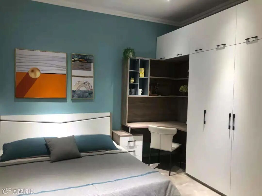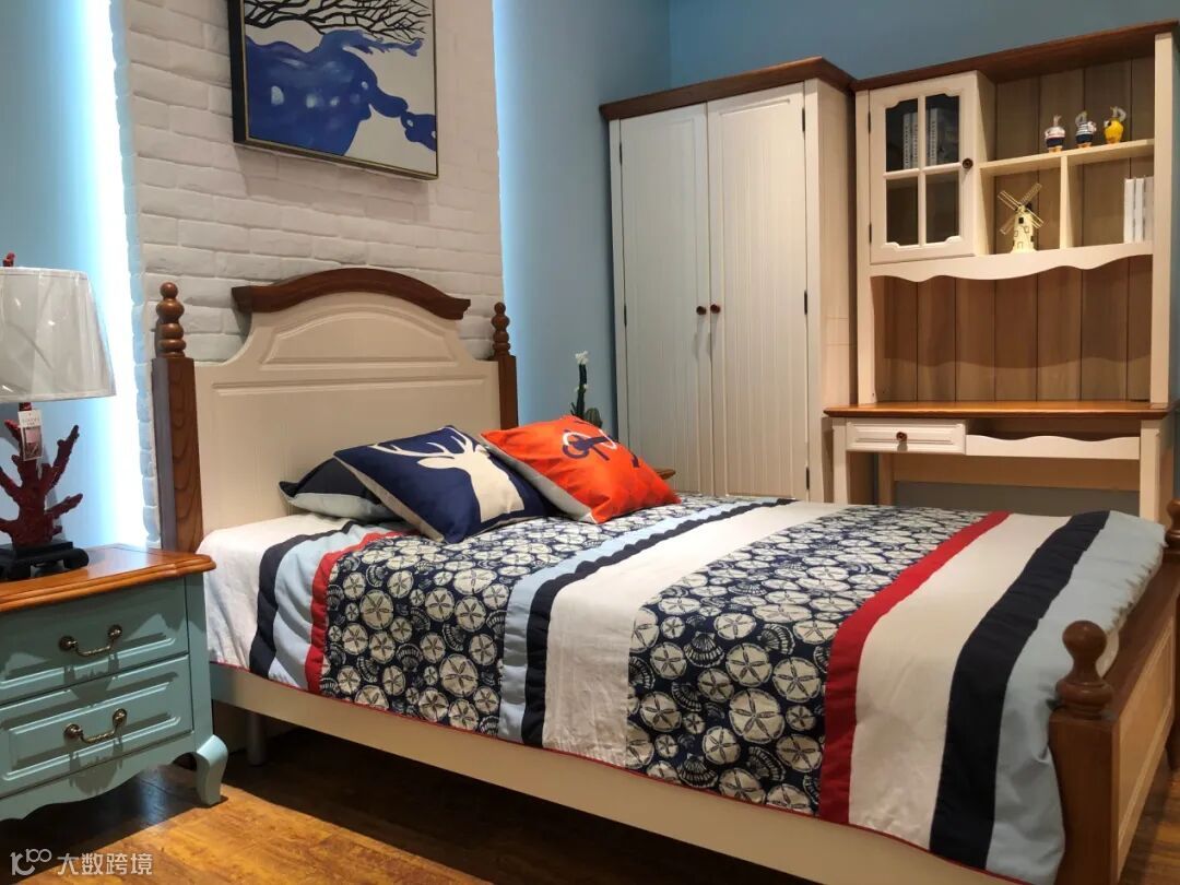 单人床配以碎花点缀,以及木地板和白柜子的结合,再配上实木小蓝色床头柜,以及写字台,作为学生一族的套房之选再适合不过,或者作为年轻人时尚的追求也非常合适。
