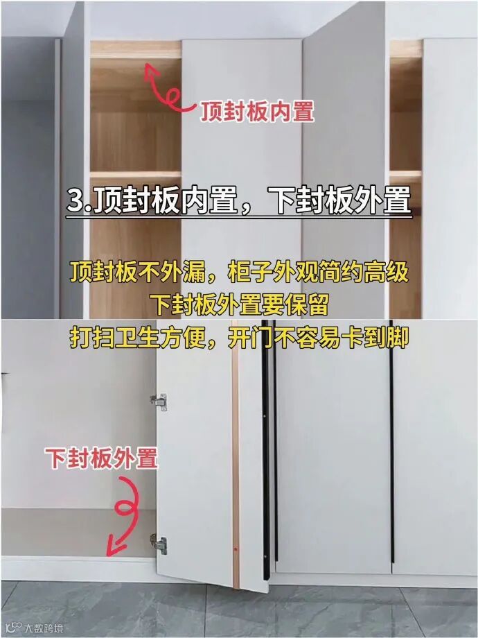 将顶封板内置,下封板外置。顶封板不外漏,柜子外观简约高级,下封板外置要保留这样打扫卫生方便,开门不容易卡到脚。
