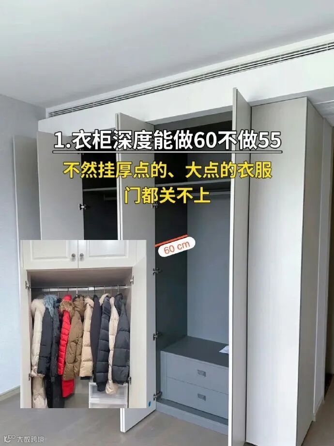 衣柜深度要做到60cm深度,绝对不要做55cm深度。不然你的羽绒服等厚一点、大一点的衣服门都关不上。