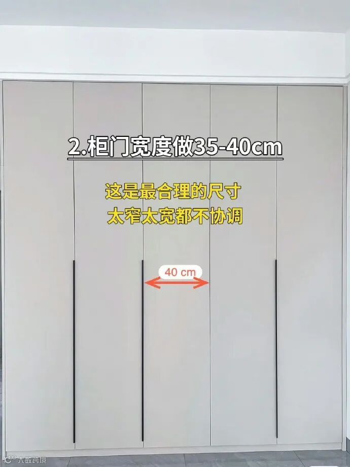 衣柜柜门每一扇宽度做到35-40cm。且尽可能每一扇门都一样,这是最合理的尺寸,太窄太宽都不协调。