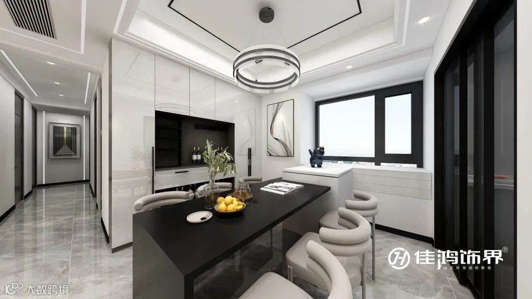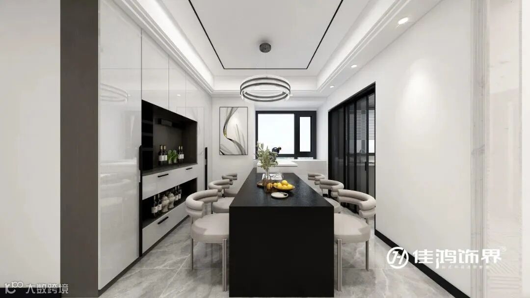 从窗边延伸出来的吧台,让其拥有用餐与操作的双重功能,既美观又实用。白色柜面与中间留空的黑色展示柜,形成了颜色上的对比,打造出了空间的深邃感与高级感。