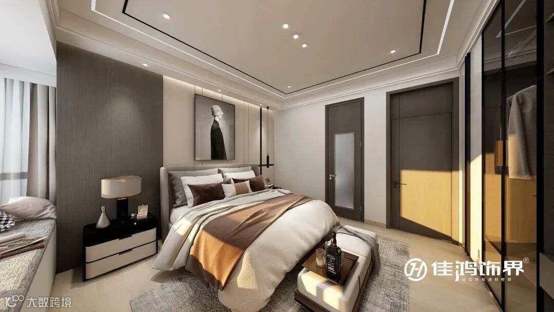 有别于客餐厅的基调,丝绒质感的床品带着柔软的曲线,咖色的点缀再次诠释了经典的品味,与整个房间的氛围达成呼应。