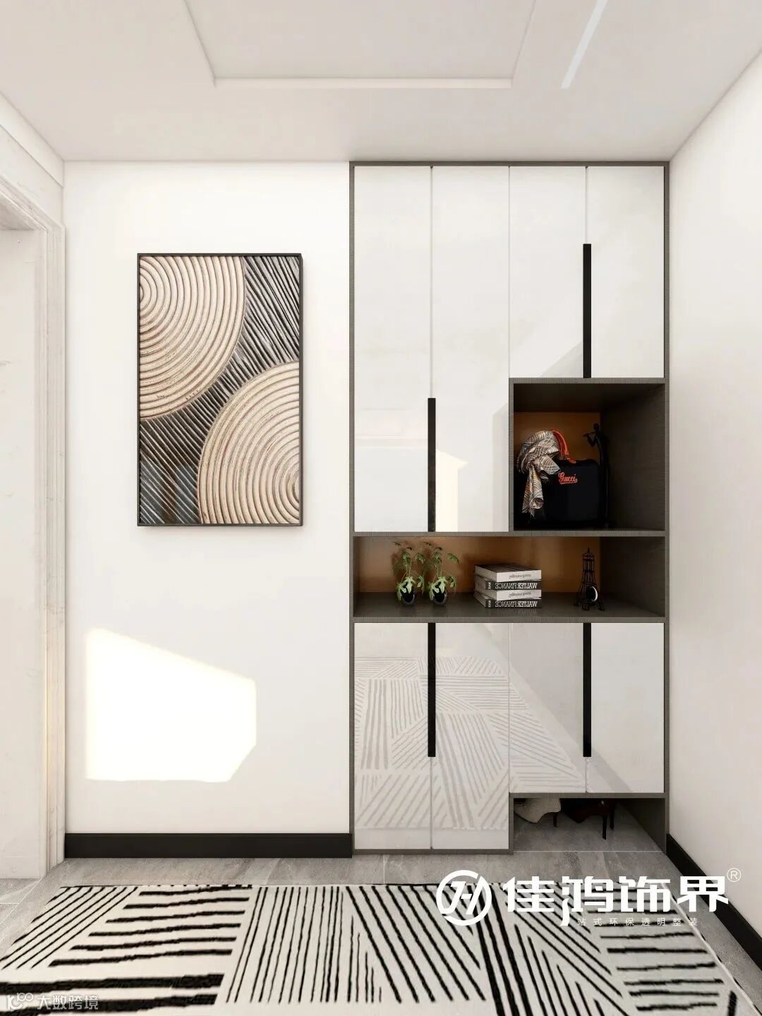 一缕缕阳光打在墙面,内嵌的鞋柜黑色把手设计,配合几何线条的挂画和地毯,有一种深邃的魅力,能让人沉静下来。