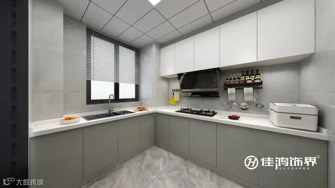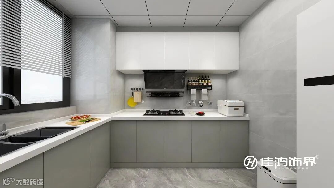 地柜采用肤感材质,伦敦雾的颜色起到平衡的作用,使视觉重心下降,岩板操作台面,“洗-切-炒”的动线流畅而自然。