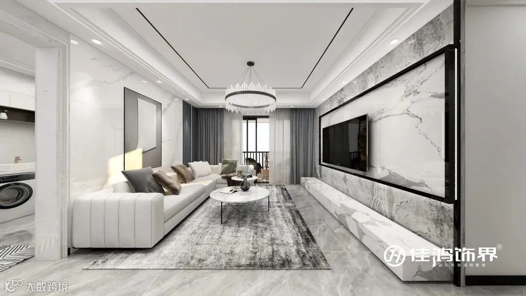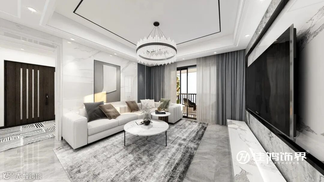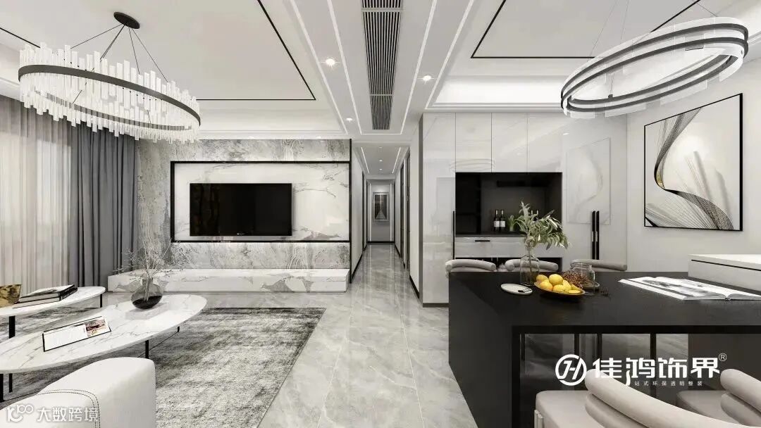 整个客厅全部使用黑白灰色系给予了空间理性简约的基调,浅灰色大理石纹的地面提升了空间的整体质感。