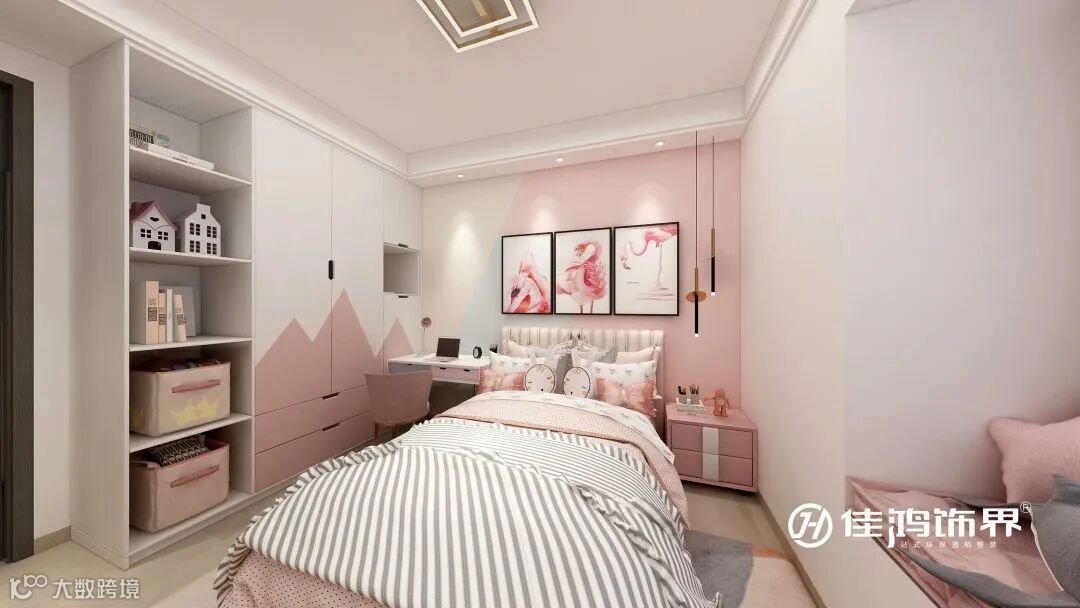 小公主的房间内充斥着一切她所热爱的元素,拼接色墙衬托错落的现代小吊灯和火烈鸟挂画,甜美色调下光线更柔和。俏皮的兔子、规则的条纹、树屋的装饰充满着童真的奇思妙想。