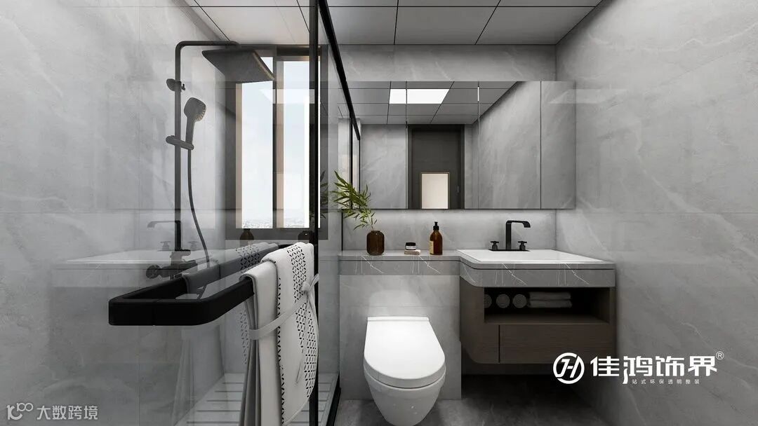 主卫使用哑光系列的材质来表达空间质感,龙头、花洒选择黑色铜质,和淋浴门通透的玻璃形成很好的契合度。同时洗手台面做加长延伸,增加洗浴用品的放置空间。