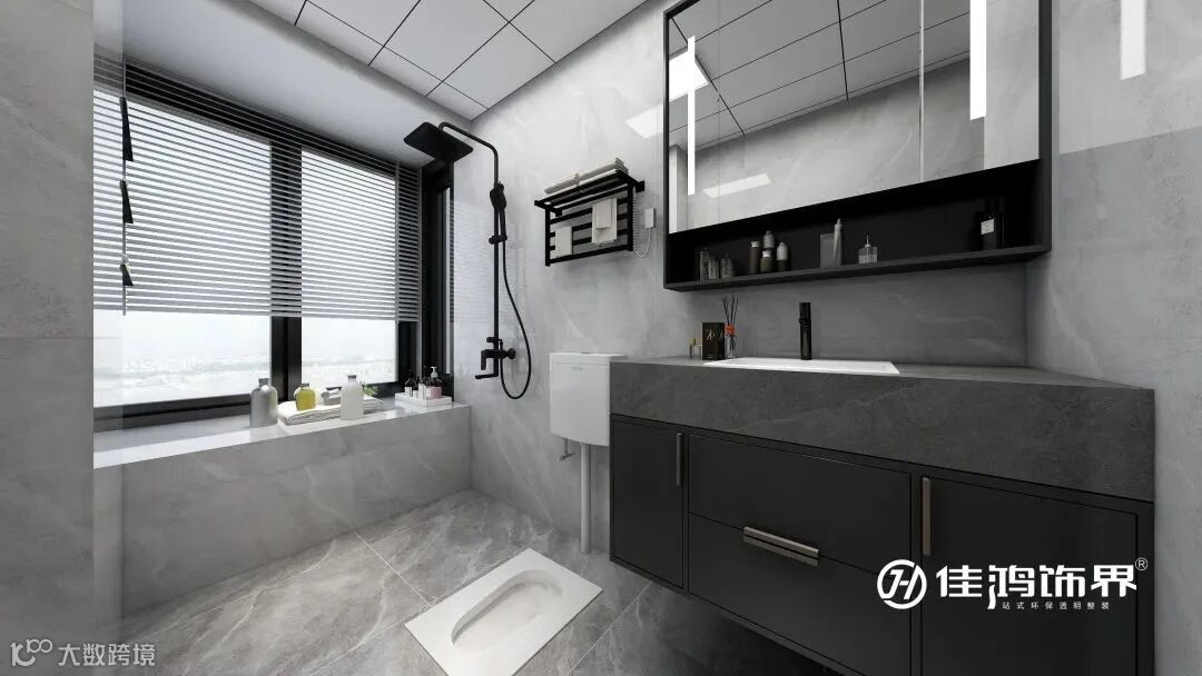 合理规划的卫浴空间,整洁舒适且富有质感。百叶帘用以调节室内光线,使用半墙放置淋浴用品活跃空间氛围。