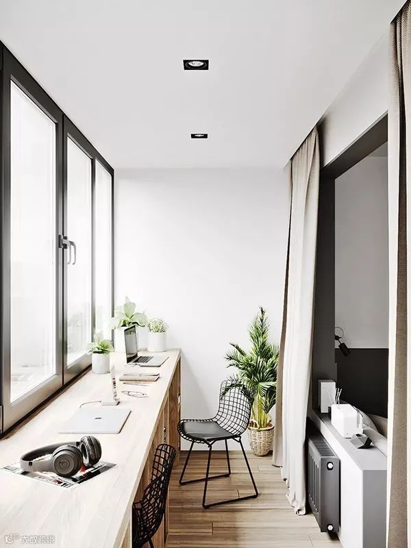 阳台风景优美,光线充足、空气清新,是学习和阅读的最佳空间,尤其适合室内面积小做不了专门书房的家。再摆上绿植,搭配百叶窗帘、灯光,提升舒适度。