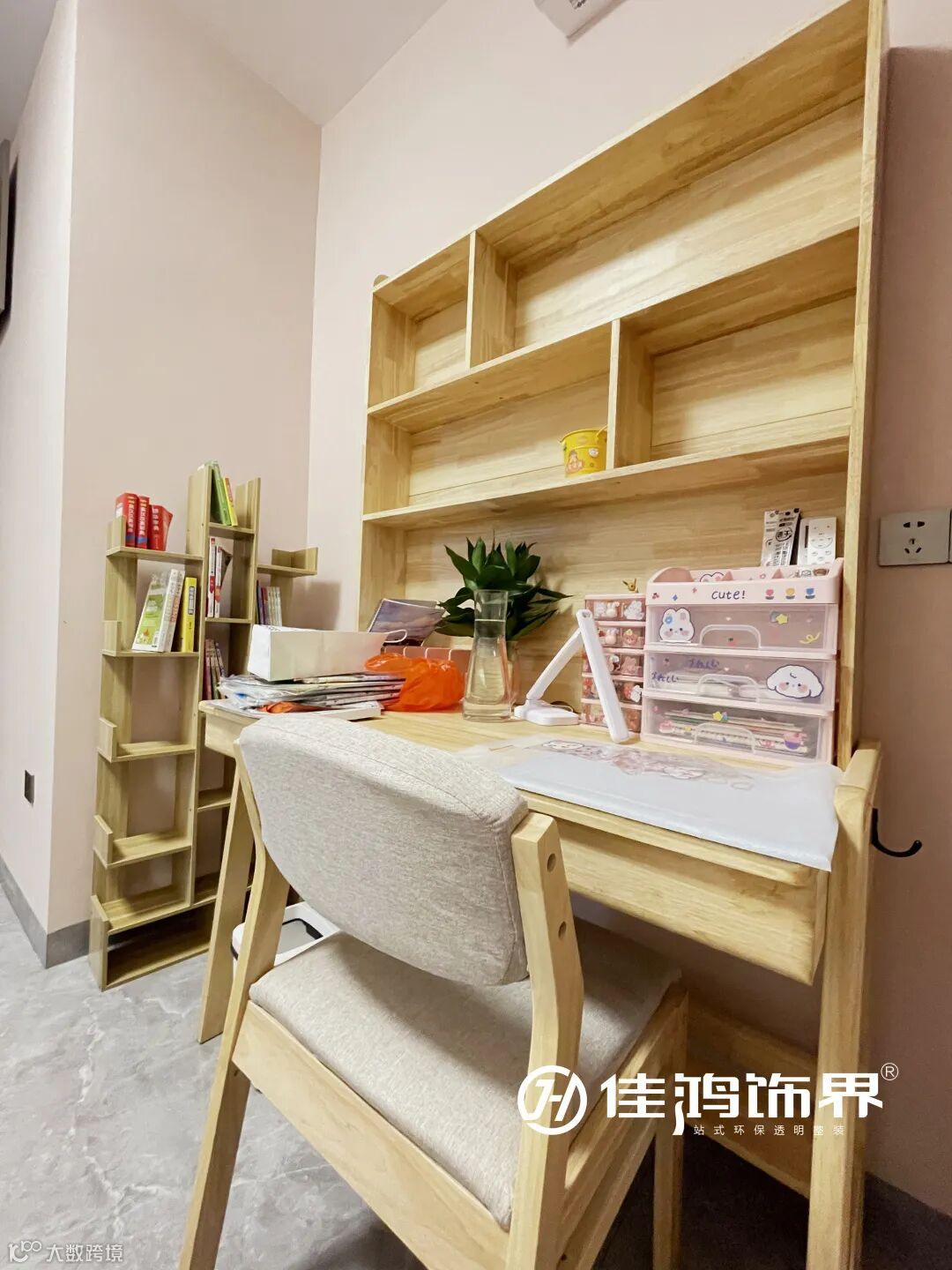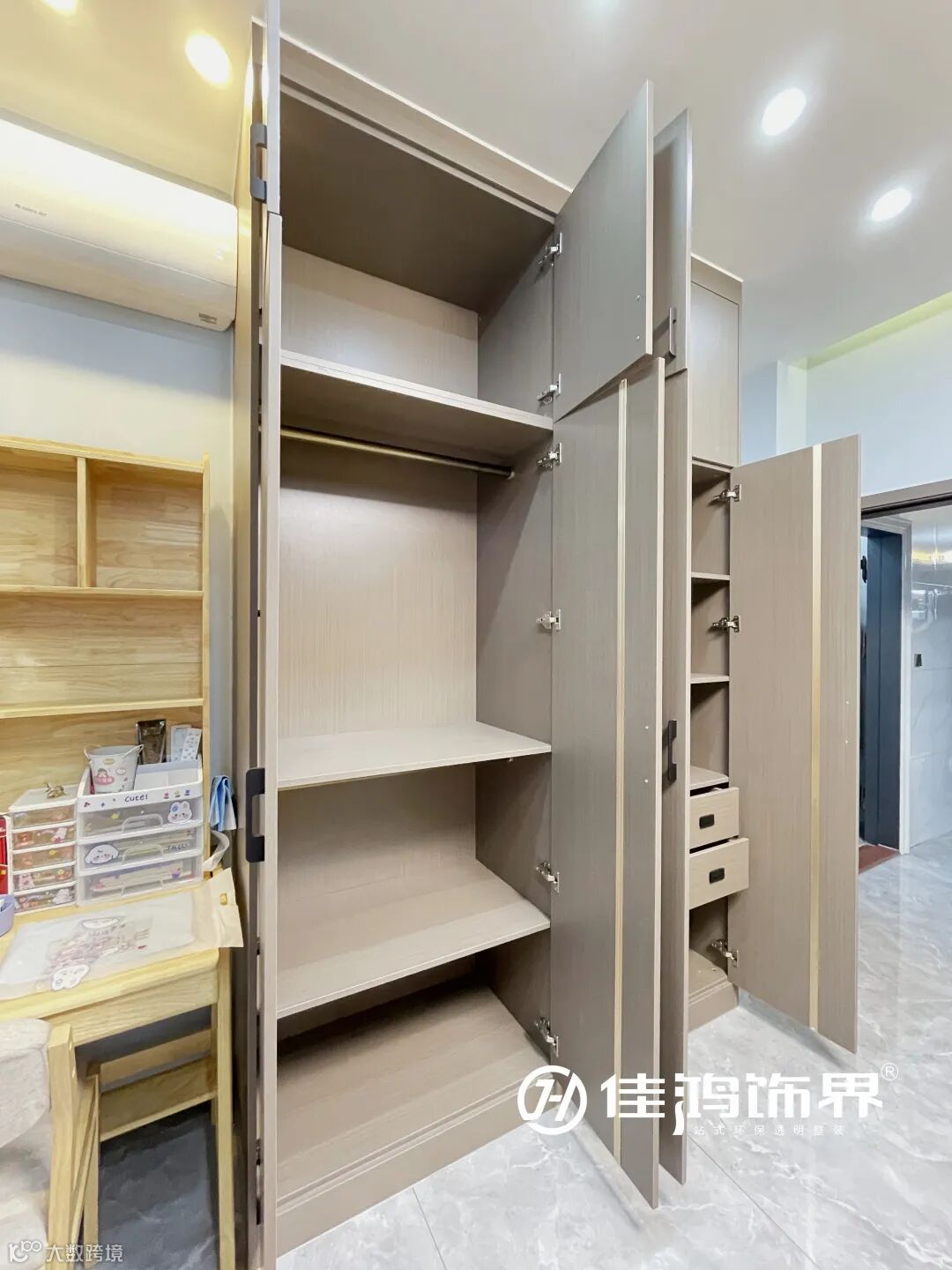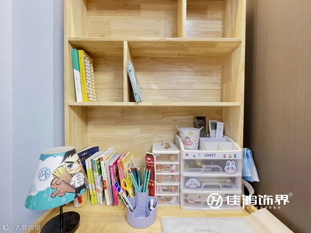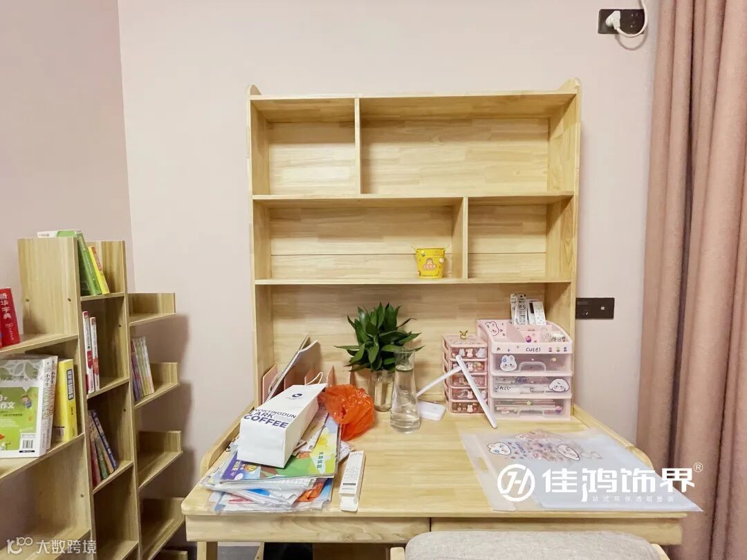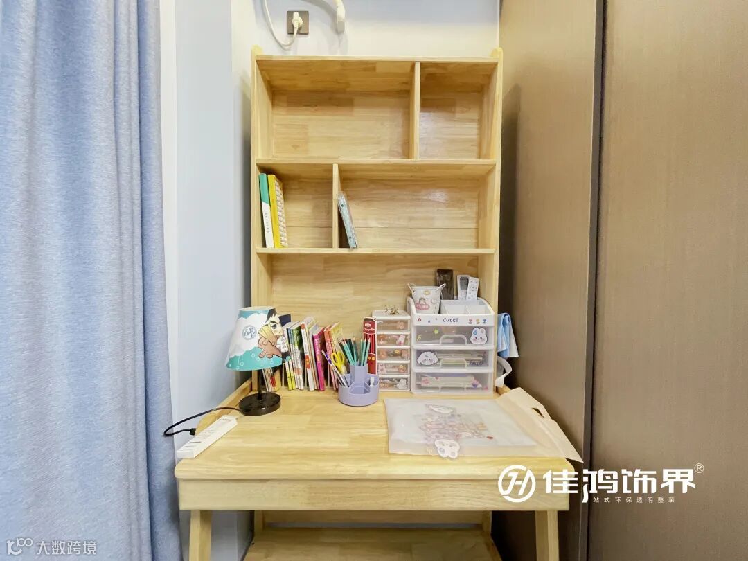 旁边的收纳衣柜可以按需存放小朋友的衣物鞋帽,定制原木书桌,为孩子的成长学习提供了充足空间。