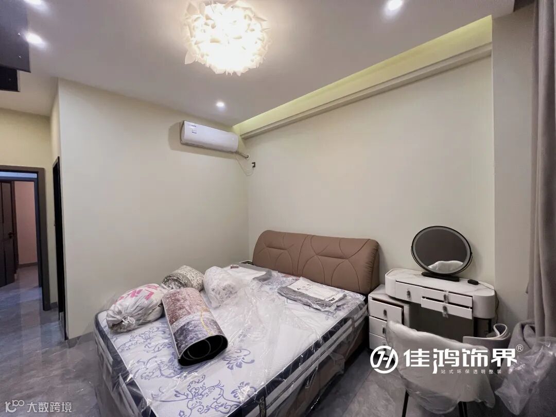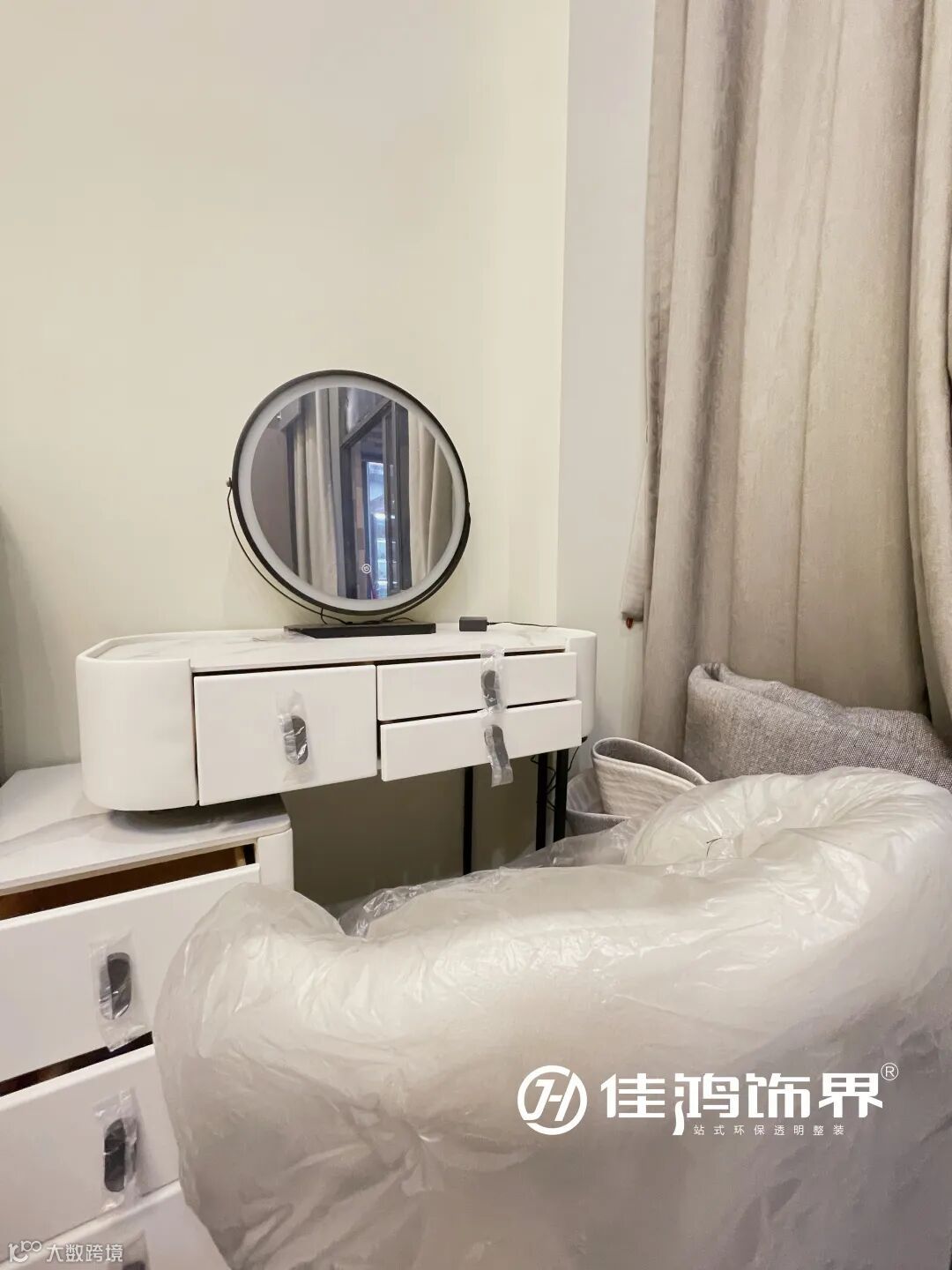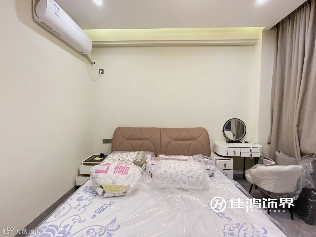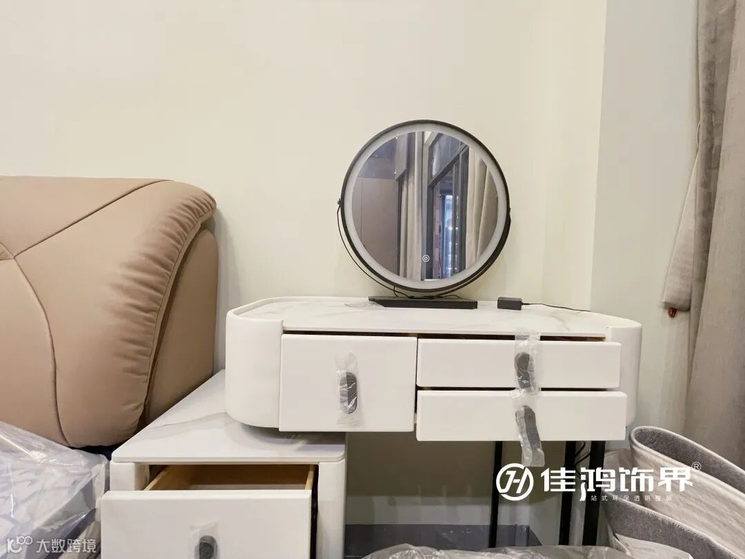 象牙白的梳妆台静落在旁,这是特地为女主人打造的一角,有了LED镜灯的加持可随时开启柔光模式,突显浪漫主义感,令时光悠闲得如同一首情诗。