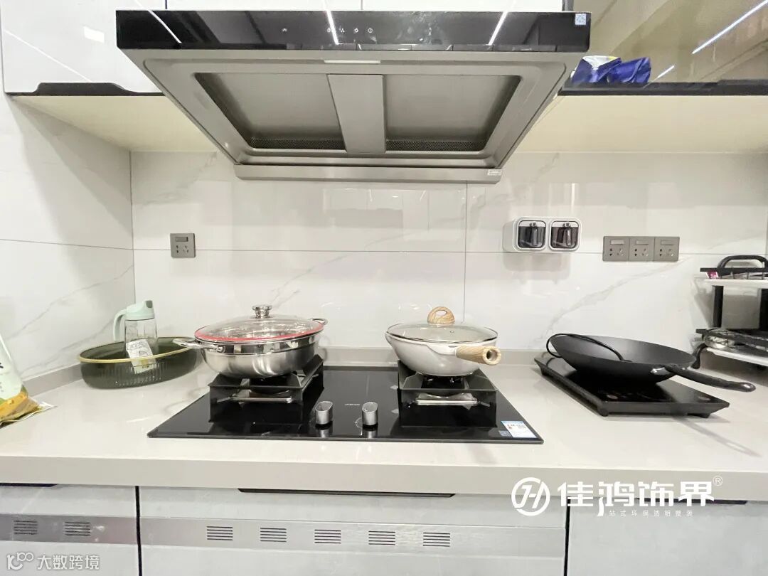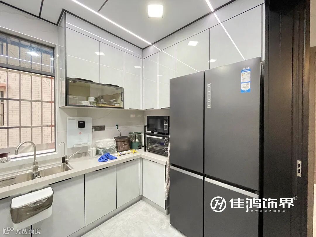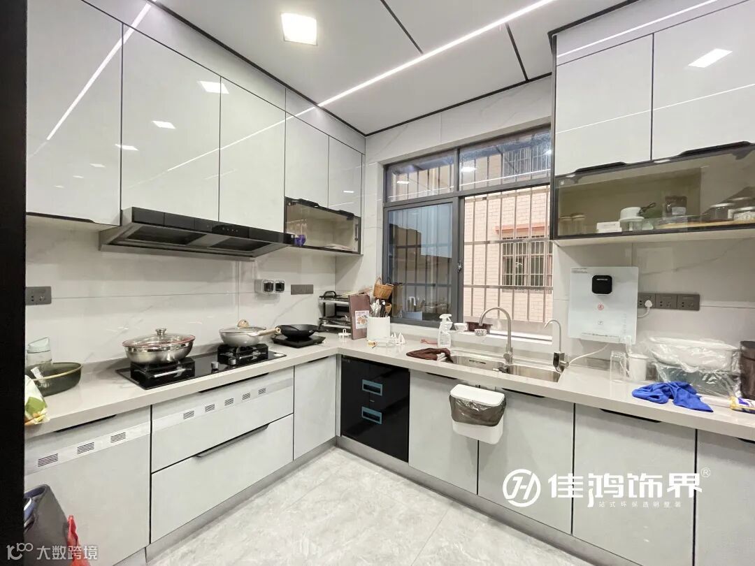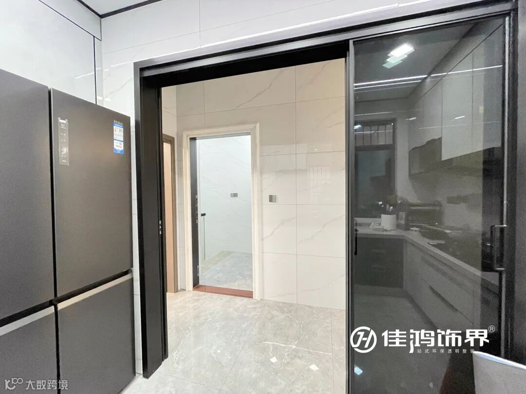 厨房采用三联动移门,隔绝油烟的同时方便使用,相比传统推拉门,因为没有地轨结构,还能有效防止小孩老人家的磕绊。