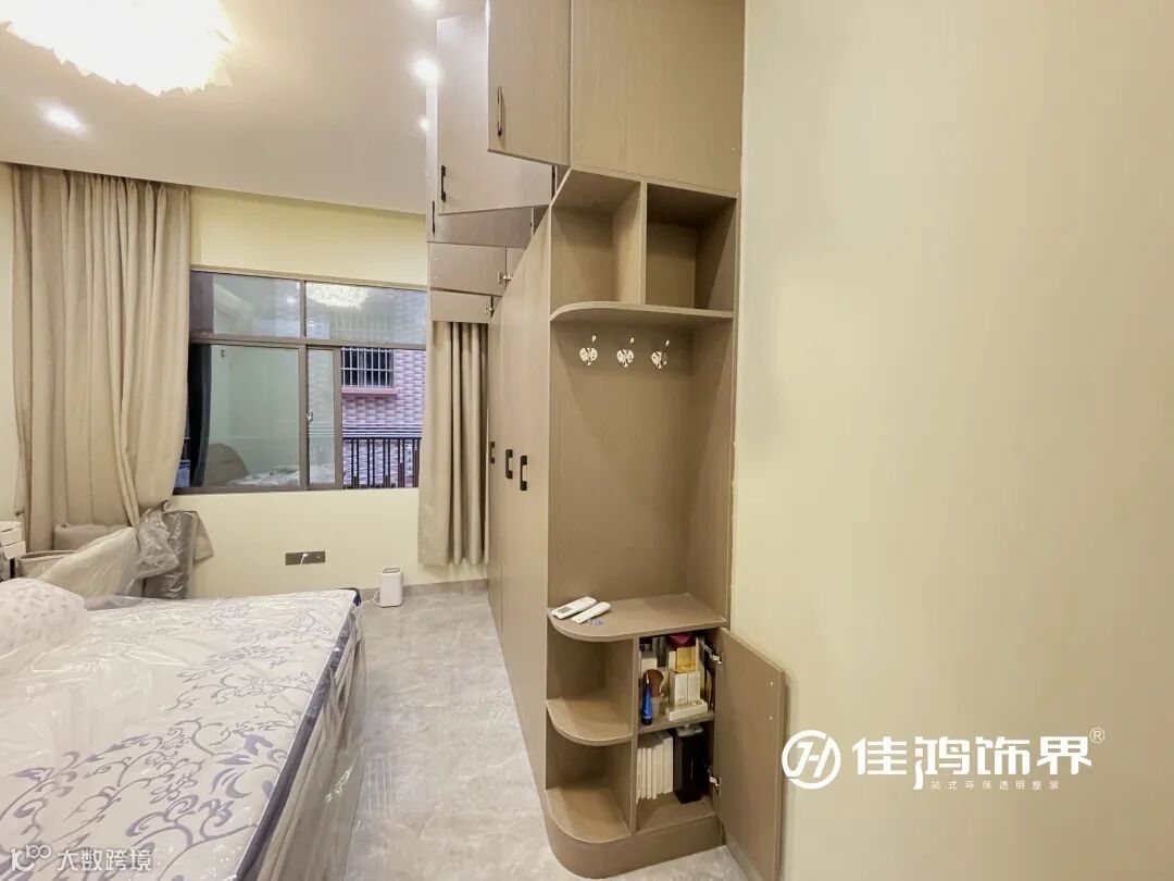 设计师利用主卧进门衣柜侧面做了挂外套包包的地方,让空间得到了充分利用。