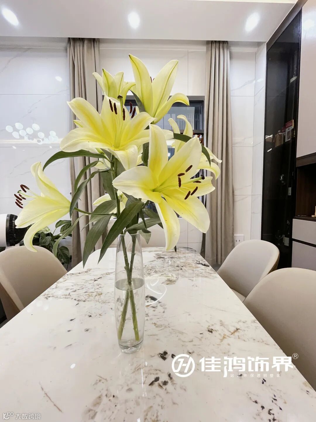 意式轻奢餐桌椅,搭配线形环绕吊灯,以百合花插瓶做桌面点缀,自然、优雅的感觉油然而生。