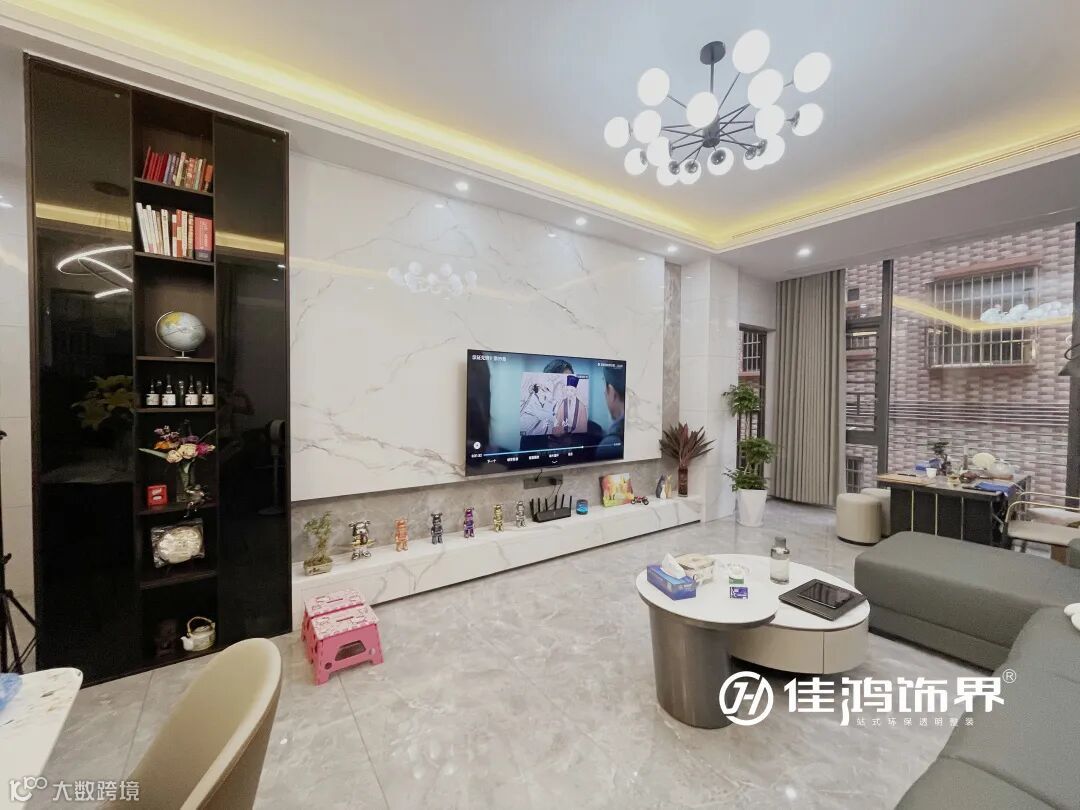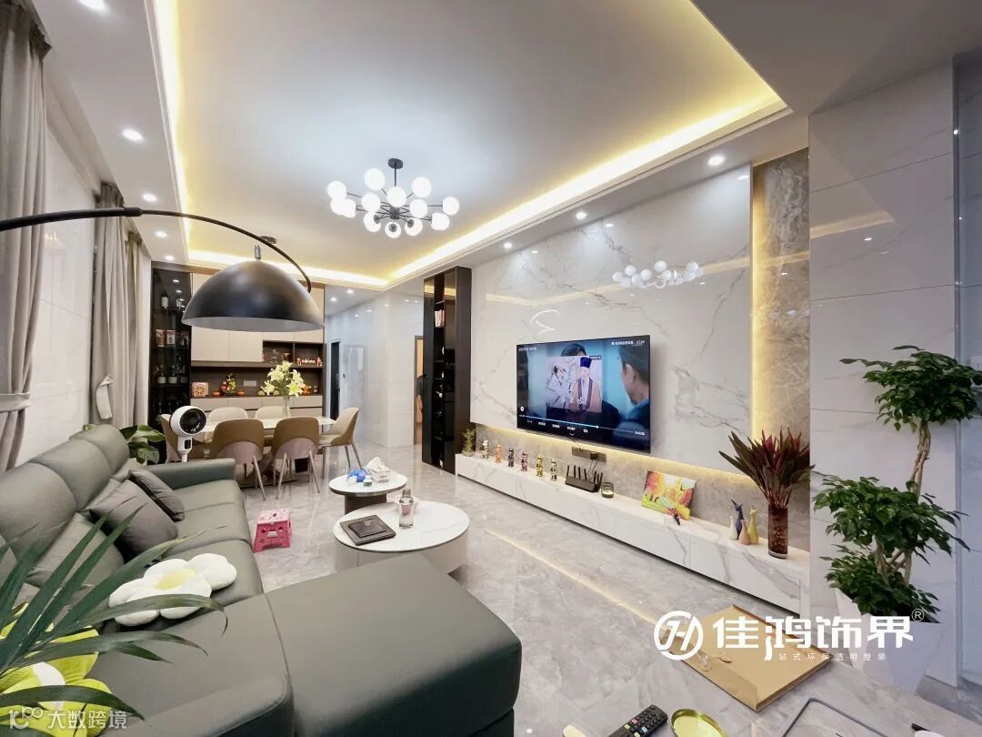 叠加的大理石电视背景墙搭配同色系地柜,内藏灯带,极简的线条勾勒出满满的生活品质感。