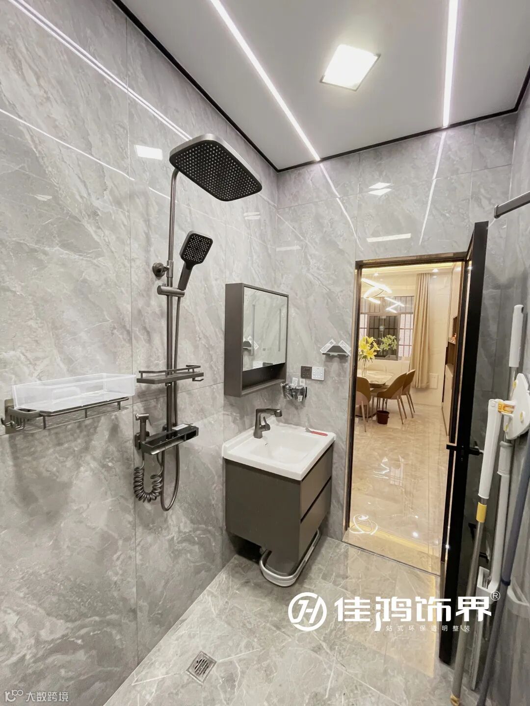 悬空镜柜浴室柜、门框、花洒等线条边框为空间勾勒出干净利落的感觉,让卫浴空间在保有现代简约的基调里,带有高级质感。