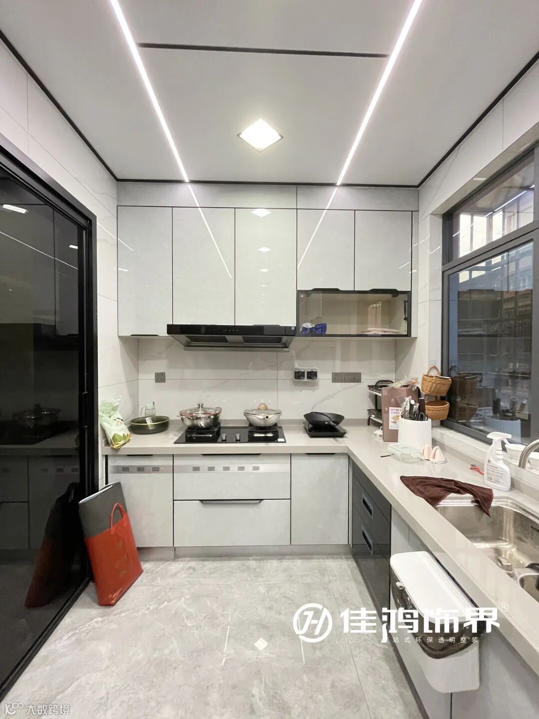 ❹厨房及入户位置的改善,原入户走道位置光线特别暗,现利用厨房+移门透光,优化了入户走道的采光和通风。