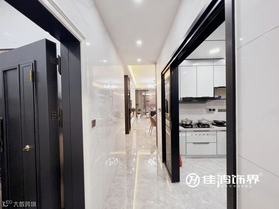 本案户型进深较大,从过道可以看出,正对入户门的是厨房,往里则是客餐厅公区和卧室休息区,呈左右两侧分布,形成流畅的洄游路线。