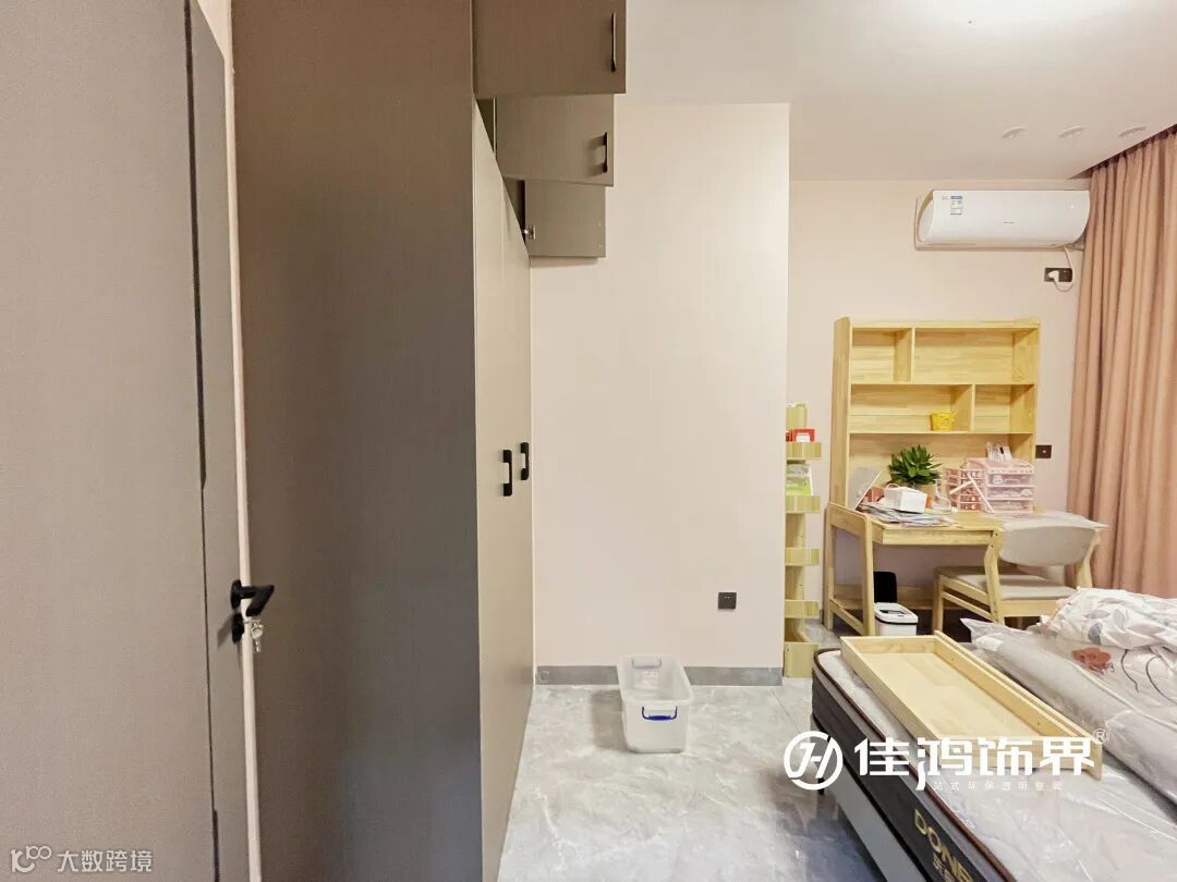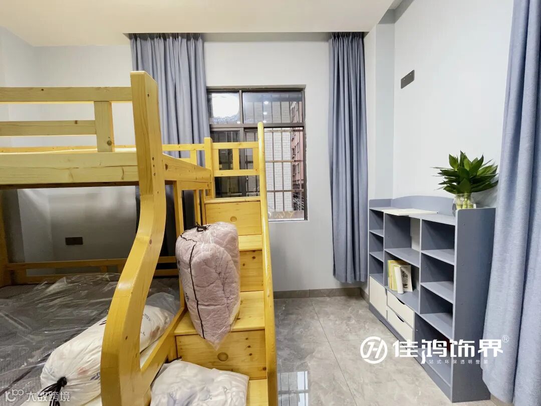 女孩房衣柜、书桌椅、床卧错落式的排布,为小朋友创造了收纳区、学习娱乐区和休息区,功能齐备不显局促。