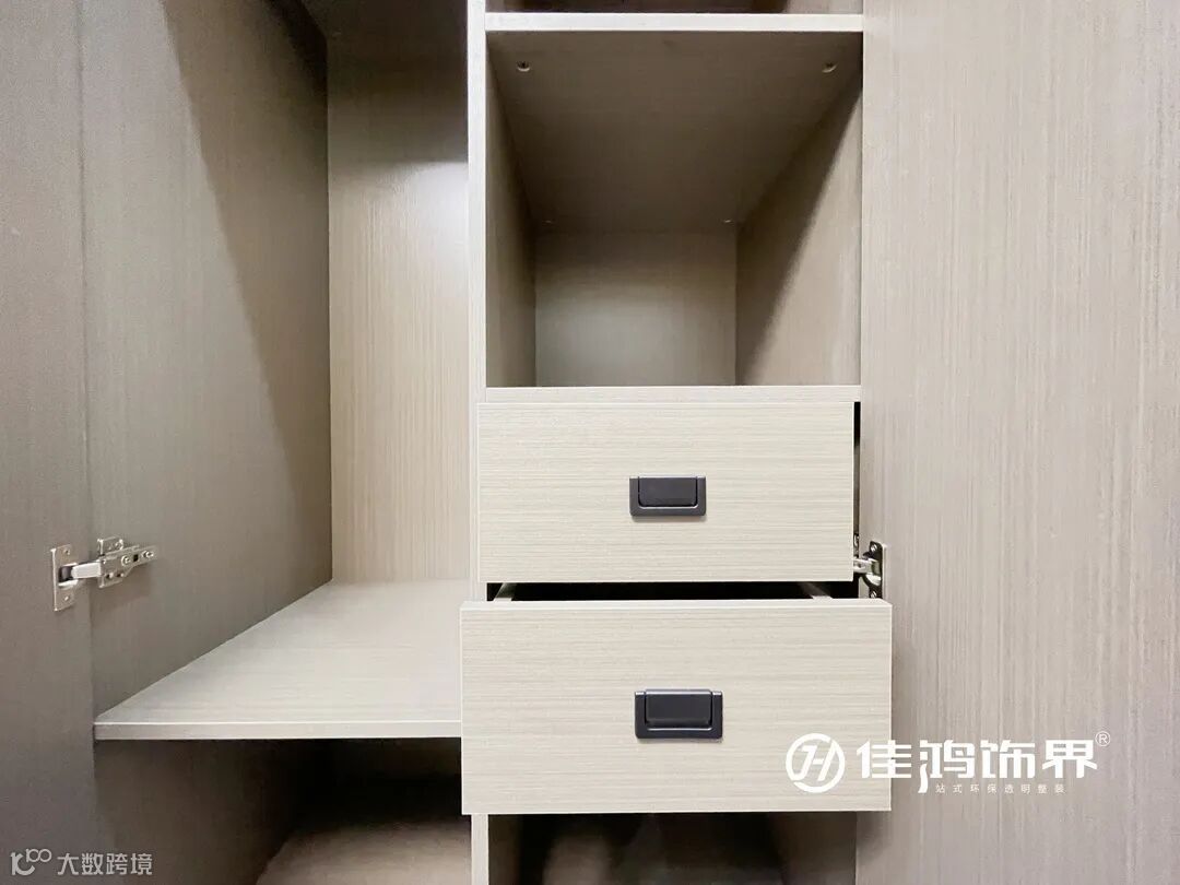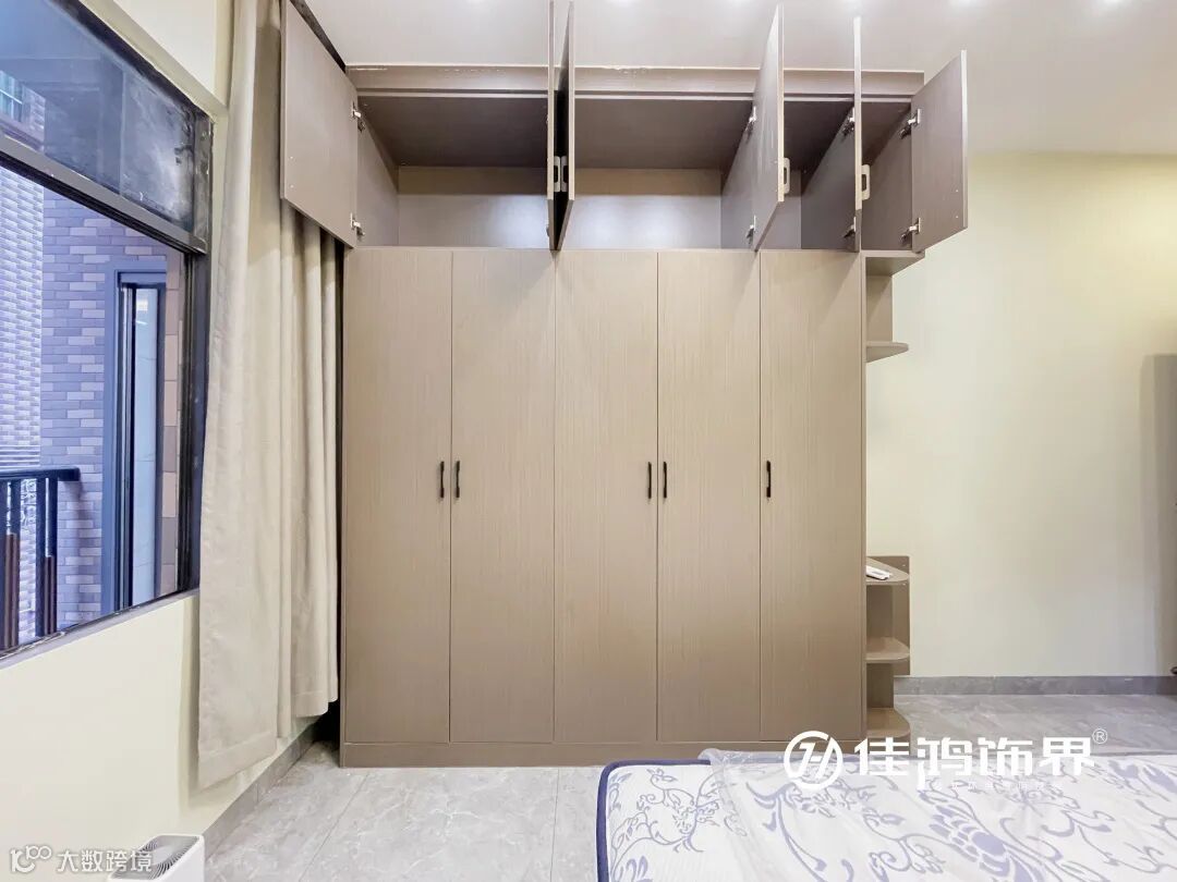 衣柜是胡桃木色,一柜到顶,不易落尘储物量大,非常的简洁大方。