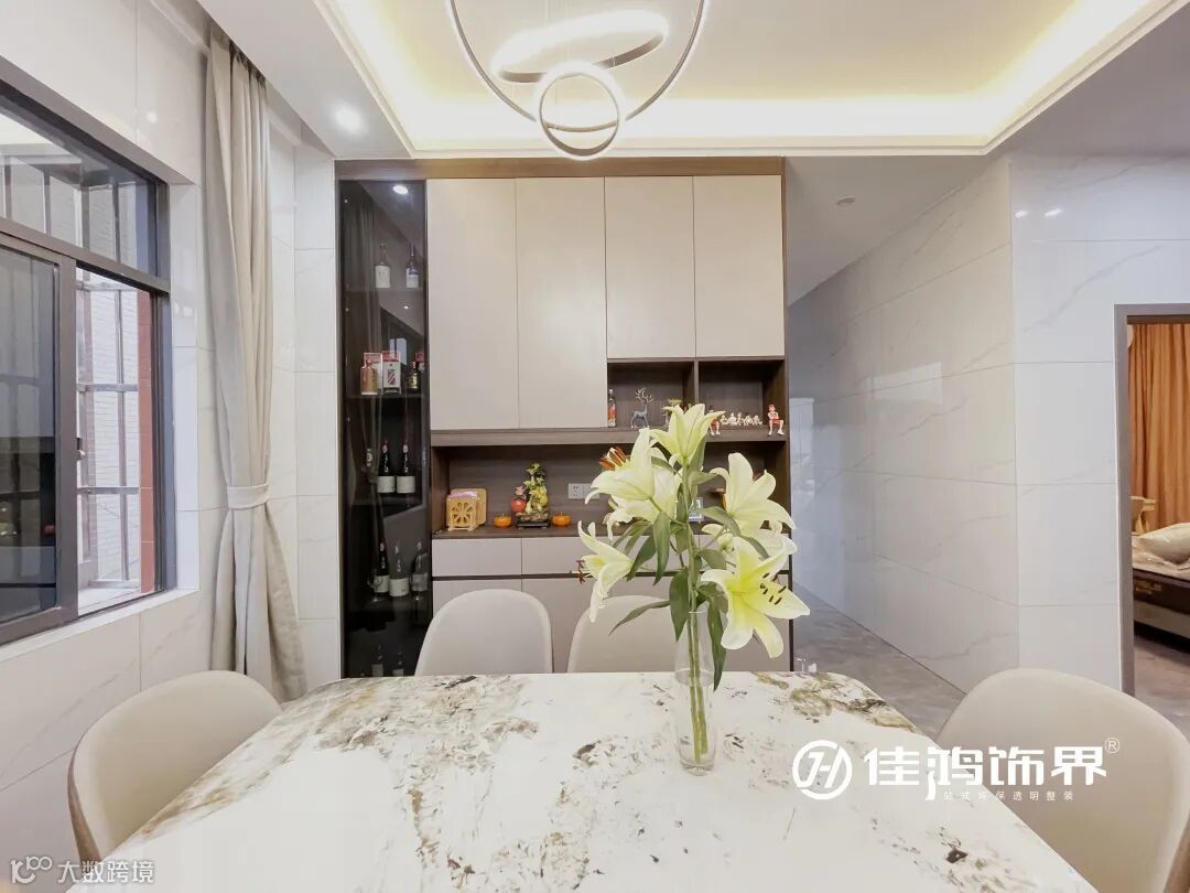 内嵌的餐边柜遵循“藏八露二”原则,既可用于展示收纳,还能摆放一些小电器,补充餐厨空间的储物需求。