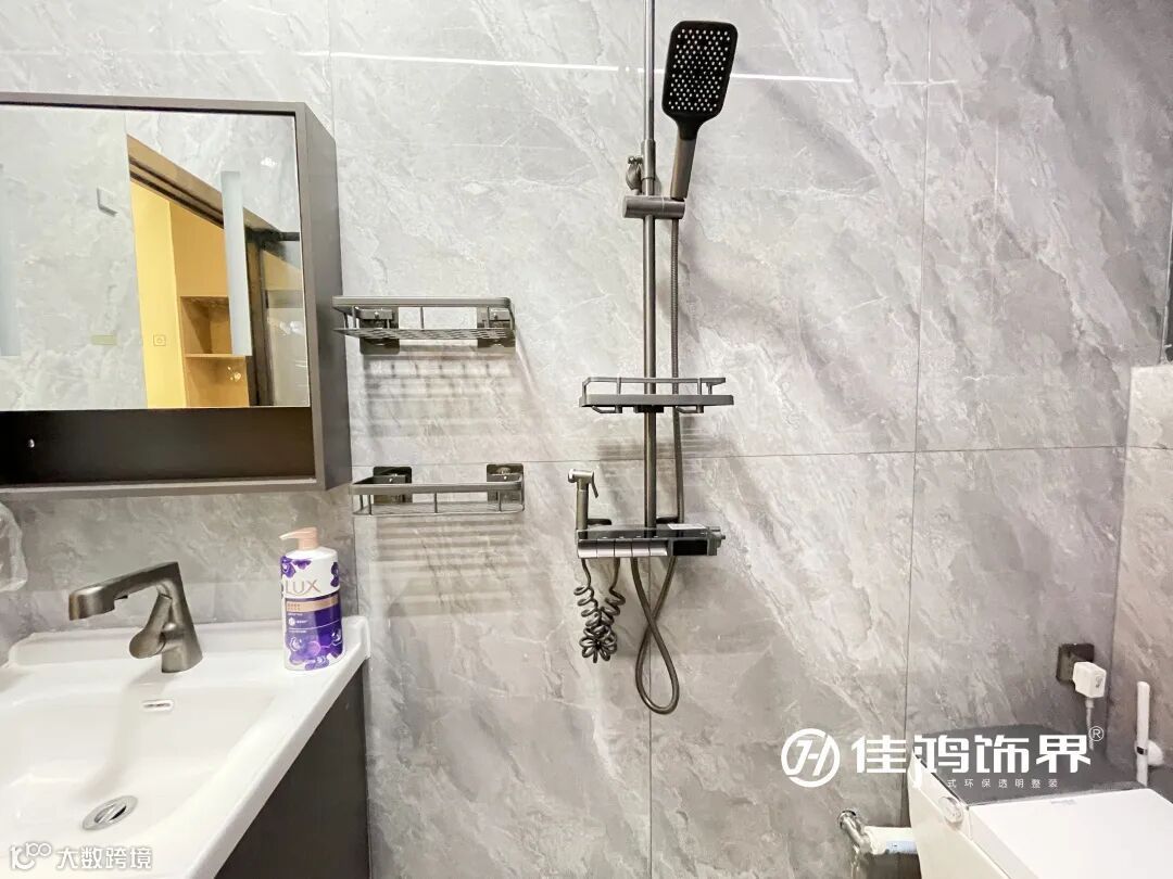 淋浴空间贴心地各设计了两个置物架存放沐浴露。在地面材质选用上,运用了哑光大理石防滑地砖,提高沐浴空间安全系数。