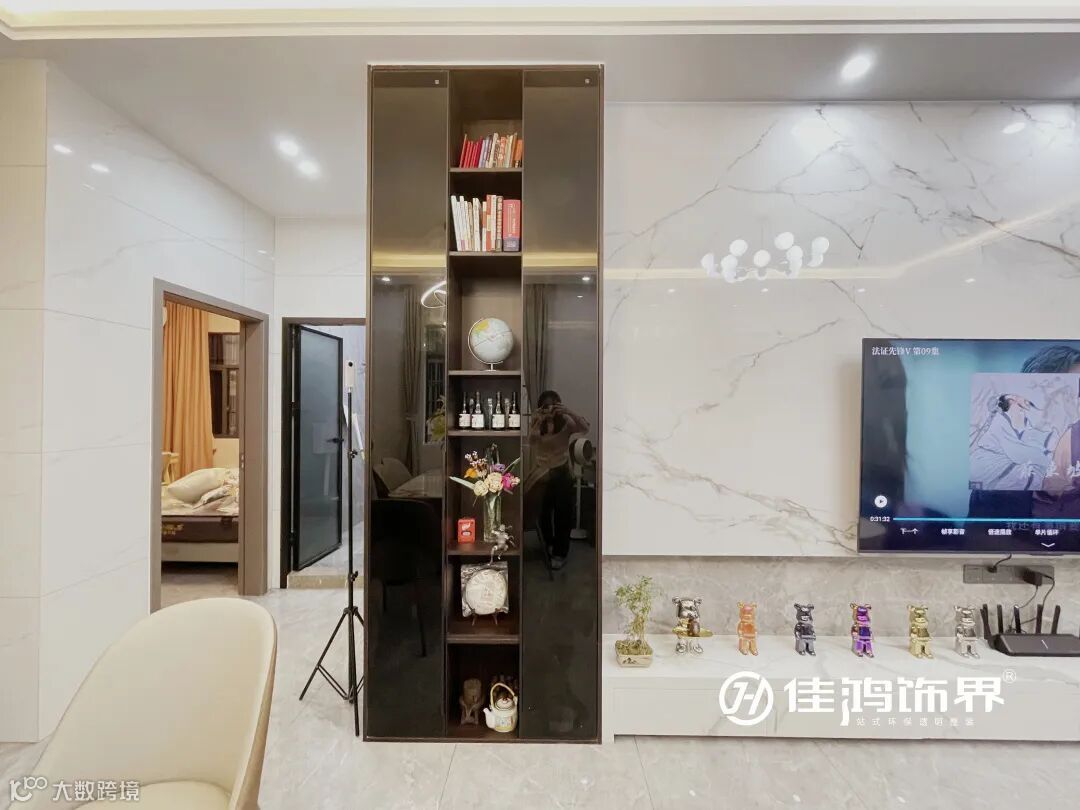 转角的设计手法将整个背景墙加宽,加入黑玻柜体,中间摆放书籍和饰品,实用性与颜值均在线!
