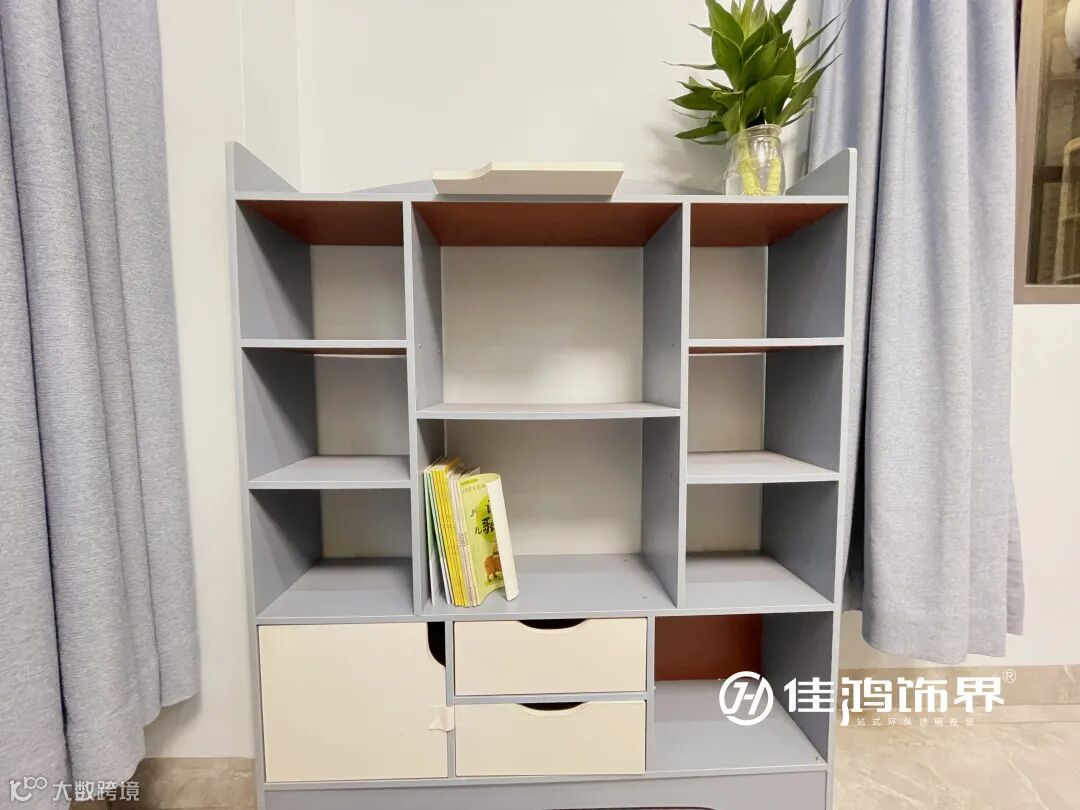 一侧布置的储物展示柜与窗帘相映成趣,既保证了功能性又丰富了空间层次感,还可以存放孩子的玩具。