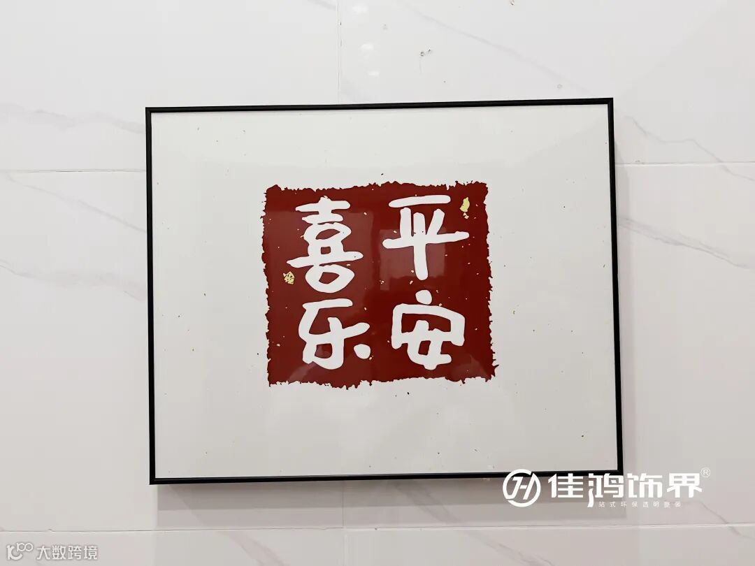 进门后,拾阶而上,我们来到了屋主一家人的生活区。一幅“平安喜乐”的挂画象征着对家人、对日子最大的期盼。