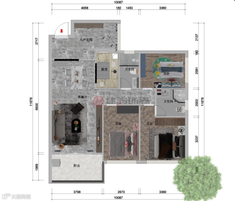 其次更改门洞方向解决女孩房正对卫生间的忌讳,保持公卫干湿分离结构。