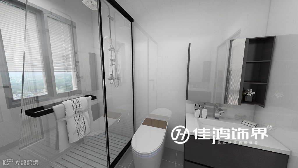 而公卫利用玻璃隔断形成了干湿分区,纯白的墙面,高级灰的地砖,还有同色系的镜柜和浴室柜,空间宽敞而又时尚,显得额外的干净大方。