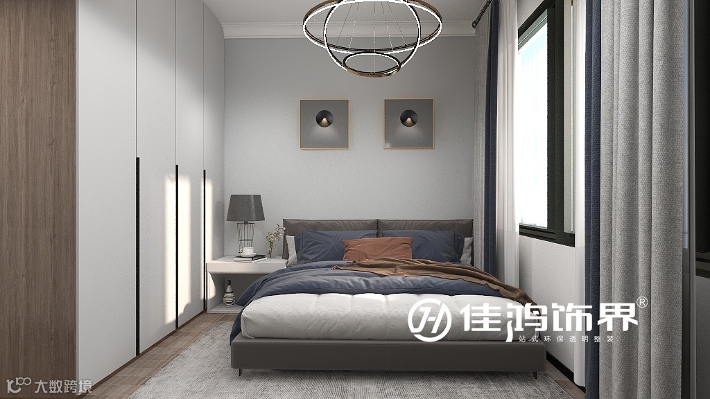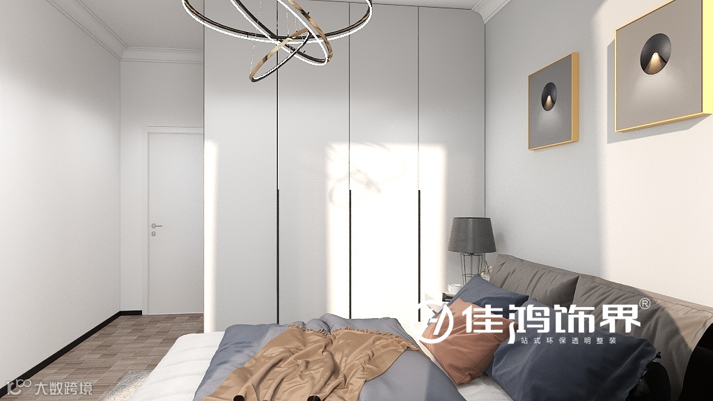 步入卧室空间后,地面也由灰色转为有更助于睡眠的深木色,阳光倾泻,衣柜无把手设计让整体效果更和谐统一。