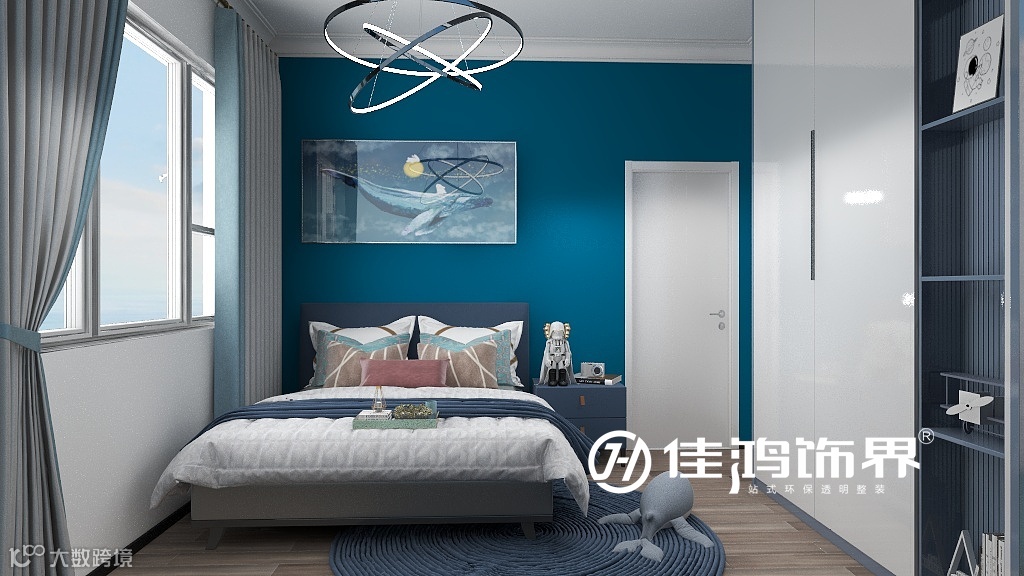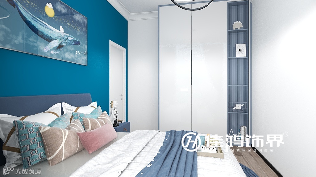 男孩房克莱因蓝的背景设计,与衣柜展示格相呼应,深蓝与纯白的结合,优雅细腻而不失少年的神秘深邃。