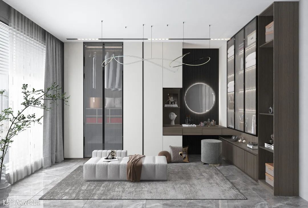 房间内侧的柜子可以打造"顶柜+矮柜"组合,摆放常用的首饰、包包、化妆品等,同时方便做一些衣物整理的家务活,丰富空间的生活功能。