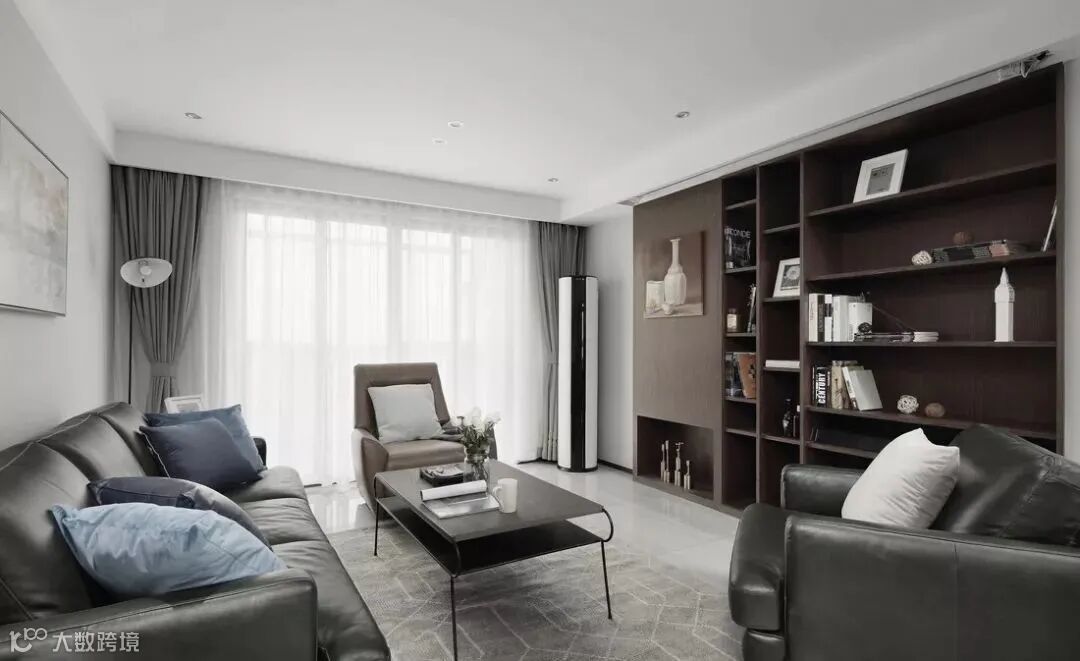 或留出几个开放式展示柜,将相框、装饰品、书籍摆放其中,让客厅多了一份精致感,空间看起来也更加完整了。