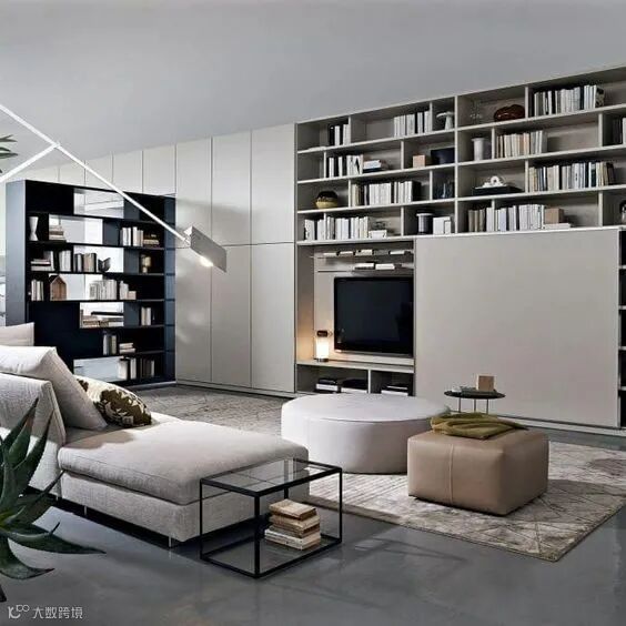你还可以根据自己的需求灵活选择,封闭式或开放式的柜门,避免视觉杂乱,或者干脆将电视隐藏起来,需要的时候打开移门,就能为整个客厅颜值加分不少哦~