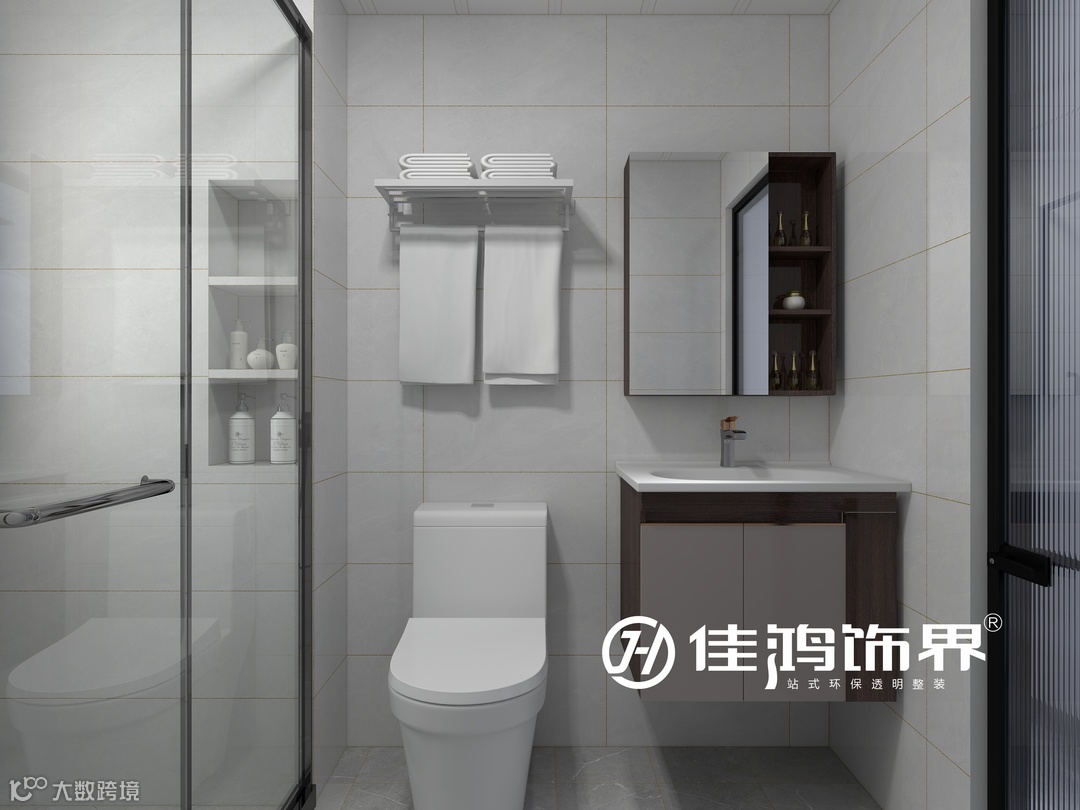 公卫内侧只保留了淋浴和马桶的功能区,上方置毛巾架,可以最大限度地为洗浴提供方便。