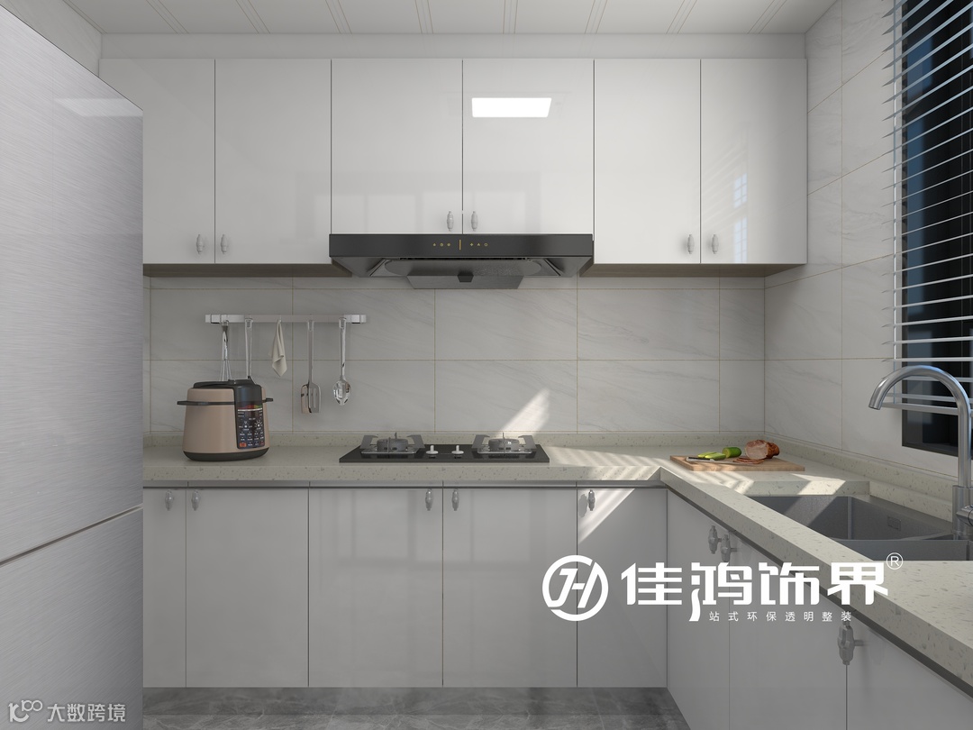 厨房以白色为主。墙面卡拉卡白大理石纹理瓷砖铺贴,橱柜面板为烤漆白色,台面为米色石英石,选用的材质都比较好打理。