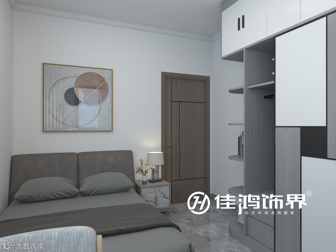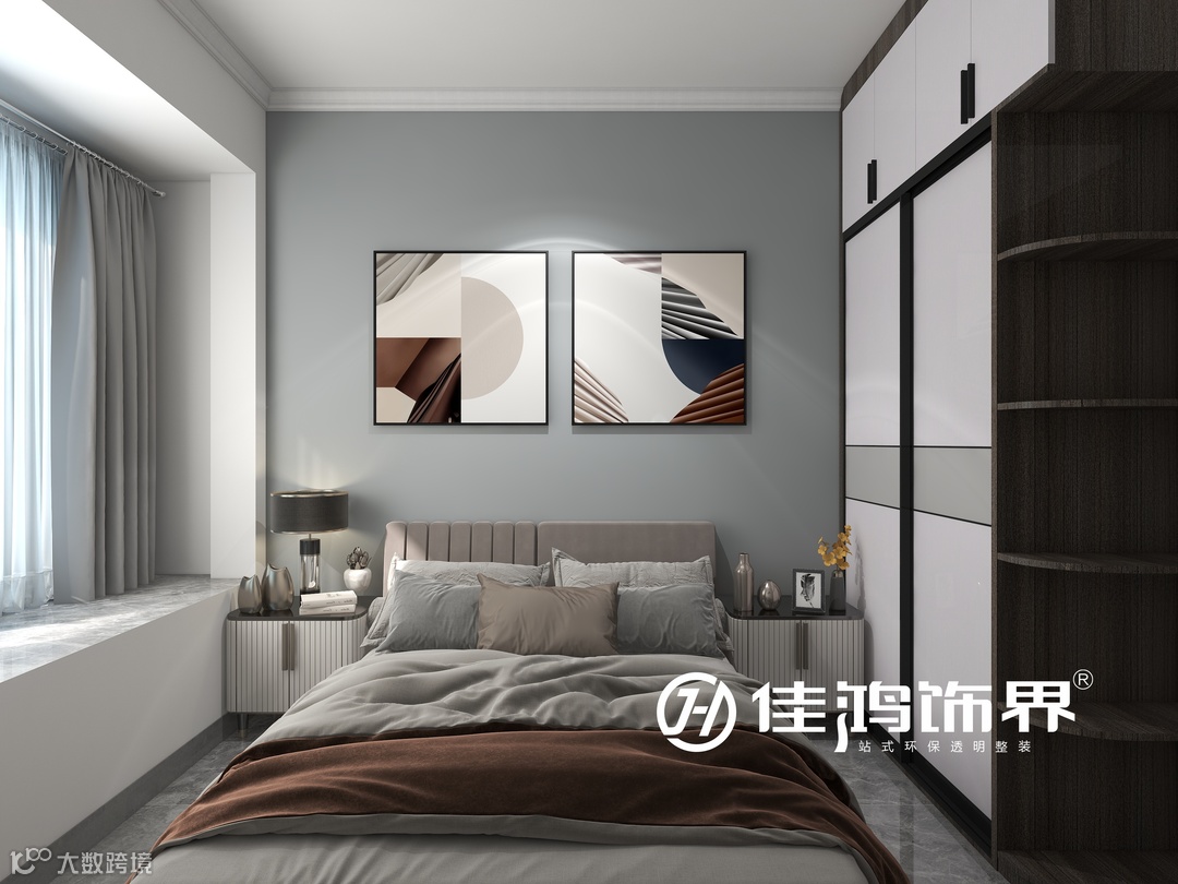 客卧整体以温馨为出发点,选用现代简洁暖色的软包布艺床卧,大理石窗面+布艺床+胡桃木衣柜,通过材质变化,增加空间整体质感。
