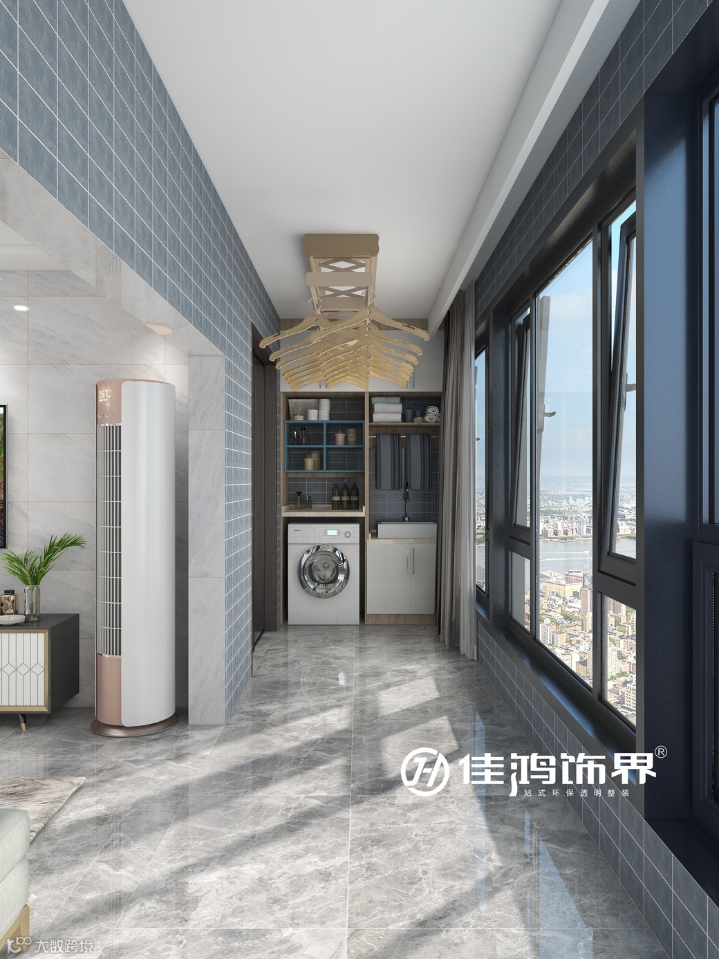 阳台的一侧根据户型定制了嵌入式储物柜,方便收纳家庭清洁工具。同时安装自动升降晾衣杆,晾晒衣物,增加阳台多用性。